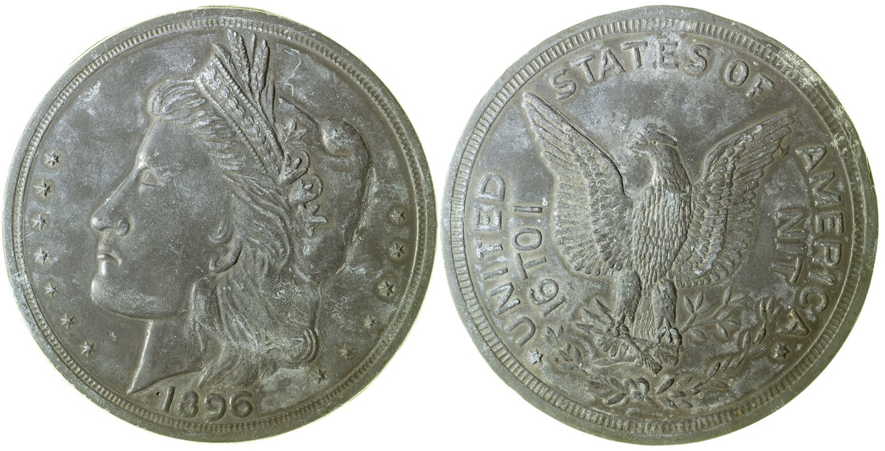 Schornstein 800. Obv.: A female head facing left. Seven six pointed stars at left. Six stars to the right. A wreath is in place of LIBERTY on coronet. 1896 below. Rev.: Displayed eagle. STATES OF on top. UNITED on left. AMERICA on right. 16 to 1 in left field. NIT in right field. Cast in type metal .87mm, 143 grams. Scarce. City: State: Date: 1896 HWAC# 51867