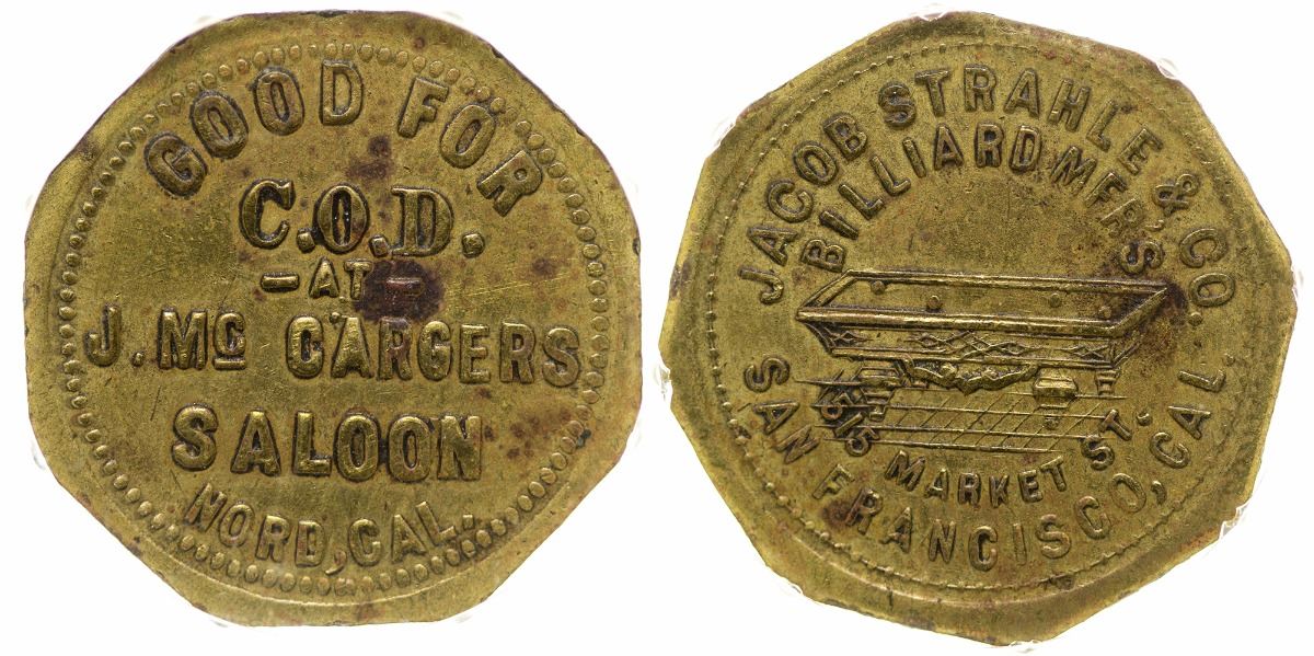 Jacob Strahle & Co. / Billiard Mfr's / 515 Market St. / San Francisco, Cal. // GF / C. O. D. / At / J. McCargers / Saloon / Nord, Cal. Octagonal, brass, 25mm. Slab, NCS, genuine. State: California City: Nord Date: c. 1890 FHWAC#: 37443