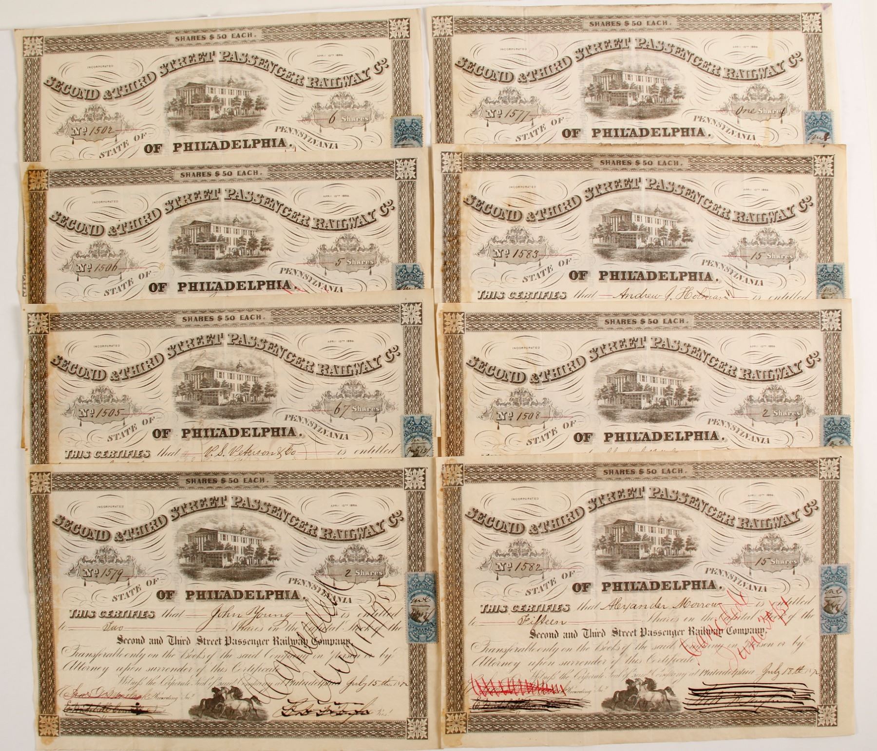8 total certificates. All have blue revenue stamps; all are signed and canceled by (illegible); printed by Sinclair; incorporated April 10th, 1858; all in fair condition, some water stains and discoloration; unlisted variety. Pennsylvania
