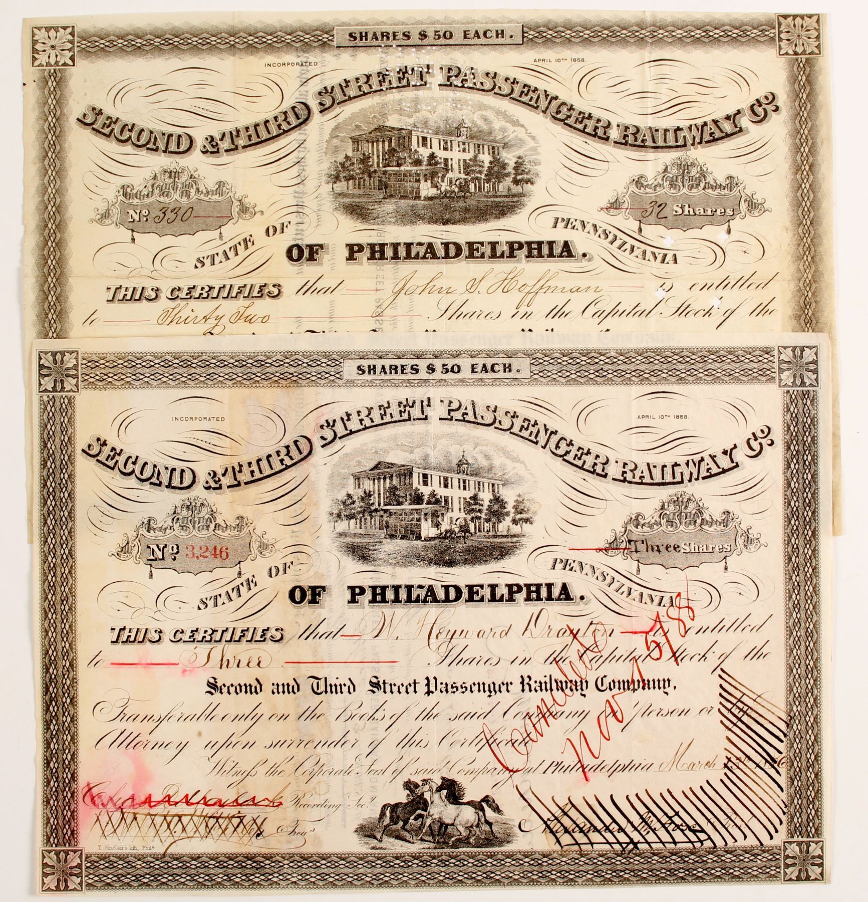 2 total certificates. Both are signed by (illegible) and treasurer (illegible), both are canceled; One has a transfer certificate glued to the back of it, see pictures; both in good condition, some fading. Printed by Sinclair.