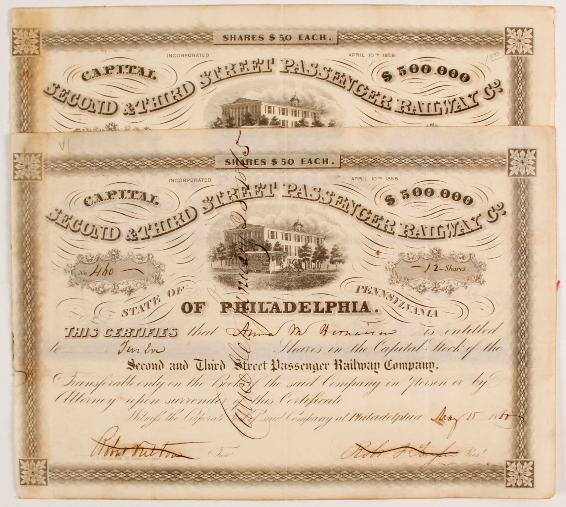 2 total certificates. Both certificates are signed and canceled by unknown; datelined May 14th, 1863 & 1860. Both are in good condition; some discoloration. Prag Collection.