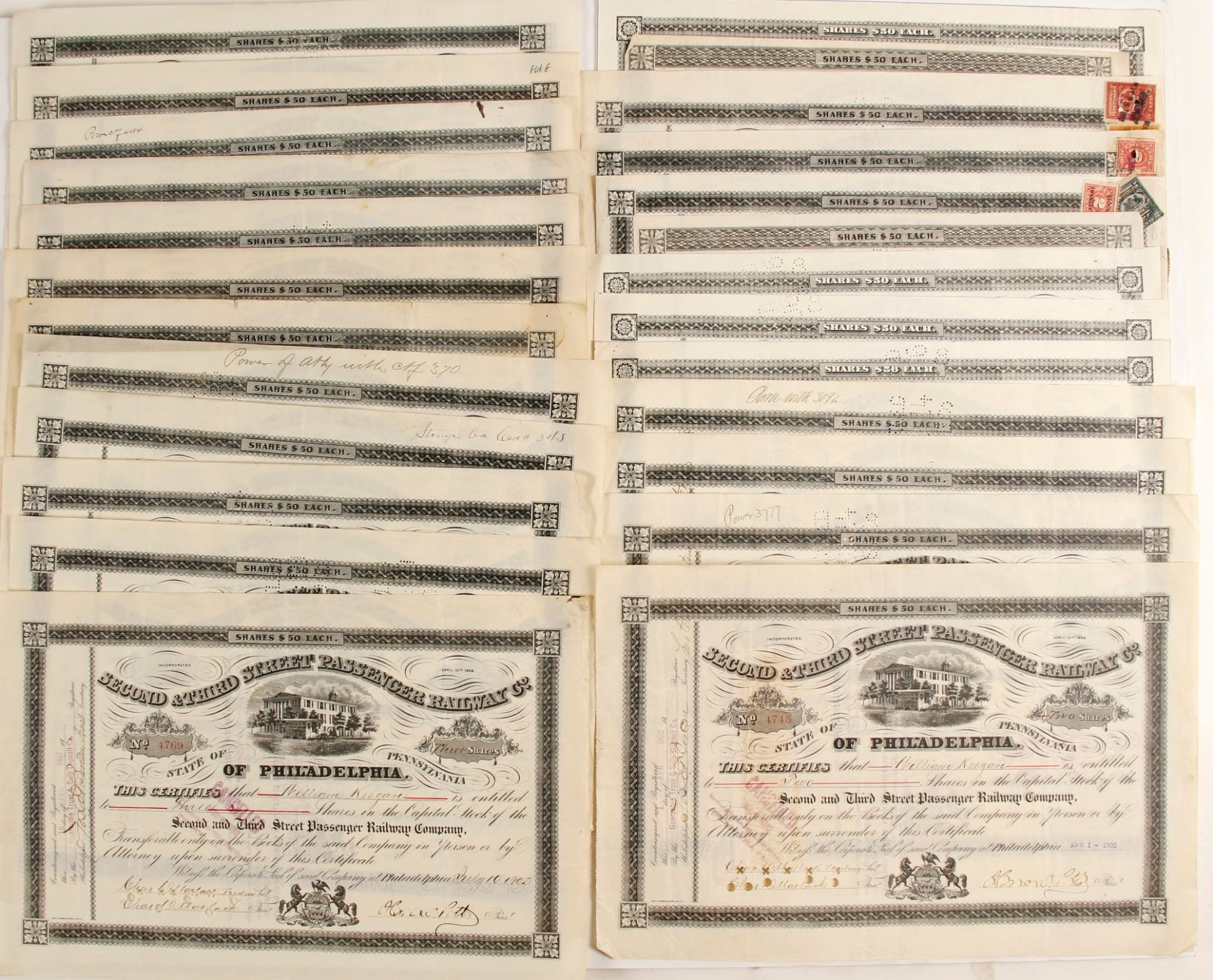 26 total certificates. 3 have revenue stamps, all in good condition, some toning and water marks on all; vignette of a street car being pulled by two horses in the upper center. Printed by Geo S. Harris & Sons, Lith, NY. . Ken Prag Collection