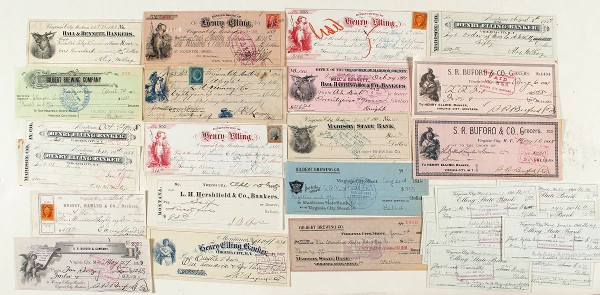 Lot of 30. Earliest is 1868 Hershfield & Bro. Next is Hussey, Dahler & Co. (1869 w/ adhesive revenue). From Henry Elling: seven, four types incl. two 1874 (red vignette, adhesive revenue w/ tied cancel), 1880 (blue vignette), three w/ no pictorial (1887-88), and one pink 1898 (allegorical vignette and adhesive revenue). Also: 1880 pictorial draft with revenue stamp; two different pictorial for Hall & Bennett (1891 & 1897); three pictorial for S.R. Buford & Co. (1888-1893); three different for Gilbert Brewing Co. (1911-1918); Madison State Bank pictorial (1905); and twelve for Elling State Bank (1905). City: Virginia City State: Montana Date: 1868-1918 ID: 36658