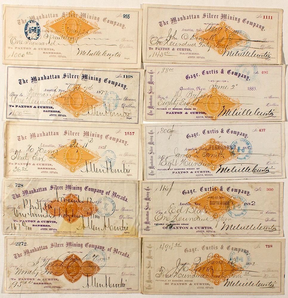 Ten different. Eight are RN-G, two are RN-D. All Manhattan Silver Mining Company. Signed by A. and M. Curtis. Cut cancels and some general soiling. See other Manhattan lots in our Mining section. (Prag Collection)