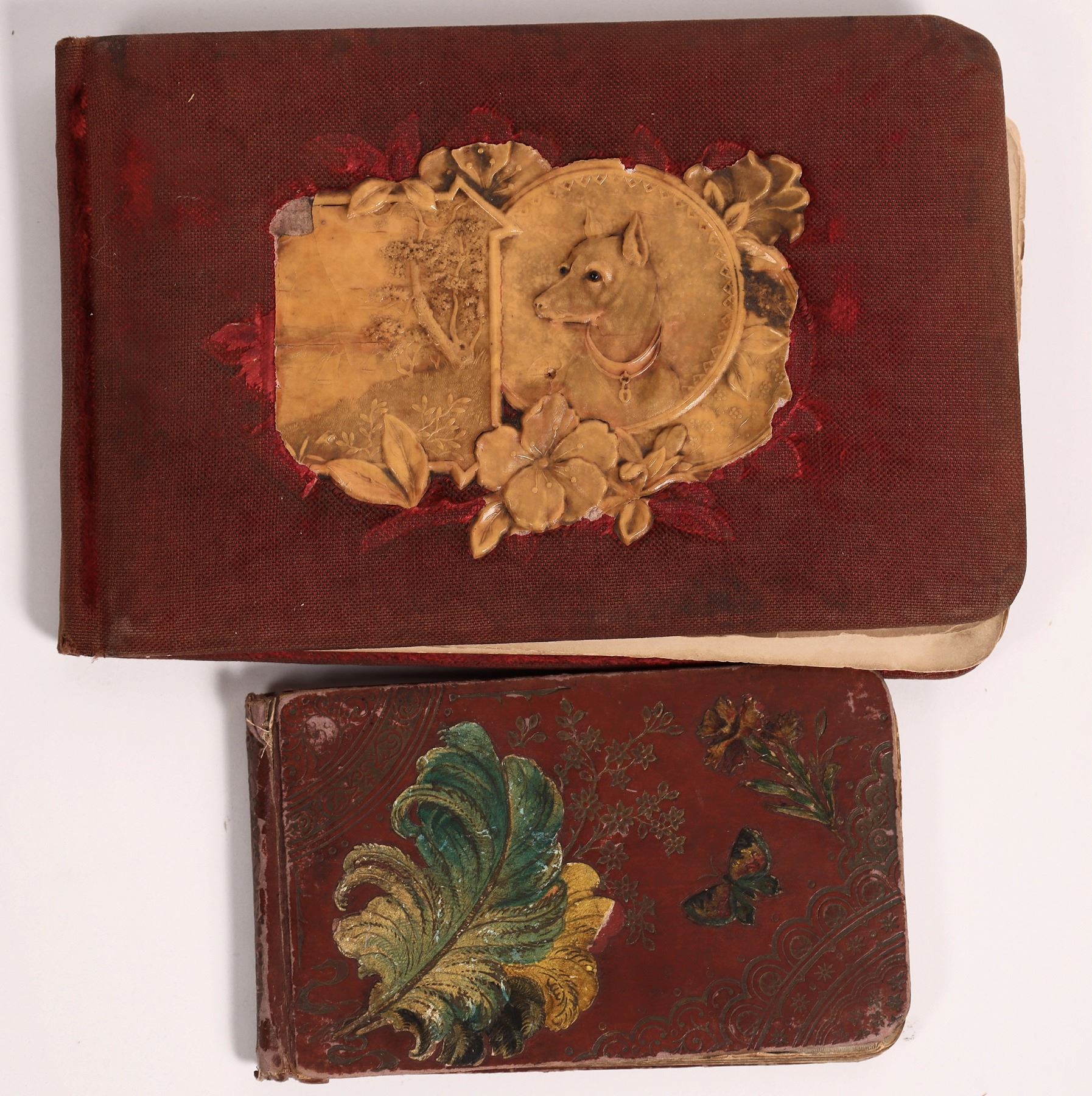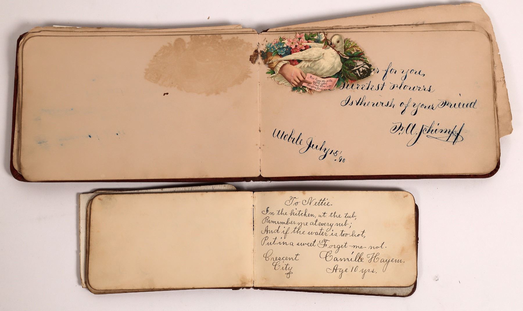 Lot of 2 small books that belonged to Jeannette Brummer 1887-1889 during her schooling in New Orleans. First Album is a 3" x 5.25" needle book with dark red cover, stamped with hand-painted decorative pattern. Inside front cover printed label reads "Blood's Genuine Needles Patent Wrapper Manufactory, Redditch, Eng." with 4 perforated paper pockets for different gage needles labeled "Sharps". Inside back cover is labelled "Blood's Combined Album & Need Case. Patent Applied For." 50 pgs.: fancy calligraphy writing with leafy vine art that reads "Henrietta Brummer." 2/3 filled w/sentimentalities, poems and personal messages from classmates, friends, family members; most addressed to "Nettie" but a few to "Jeanette". Probably belonged to an older family member named Henrietta and gifted to Jeanette. Second album 5" x 7.5" w/ cushioned red fabric cover w/golden brown embossed split picture of a dog / river scene framed with flowers. 1st page fancy printed color artwork of sailboats in a harbor labelled "Album". Approx. 35 inside pages, most with written content dated 1889/90. Blk & what photo of entryway to a trailer-type home loose inside. _x000D_