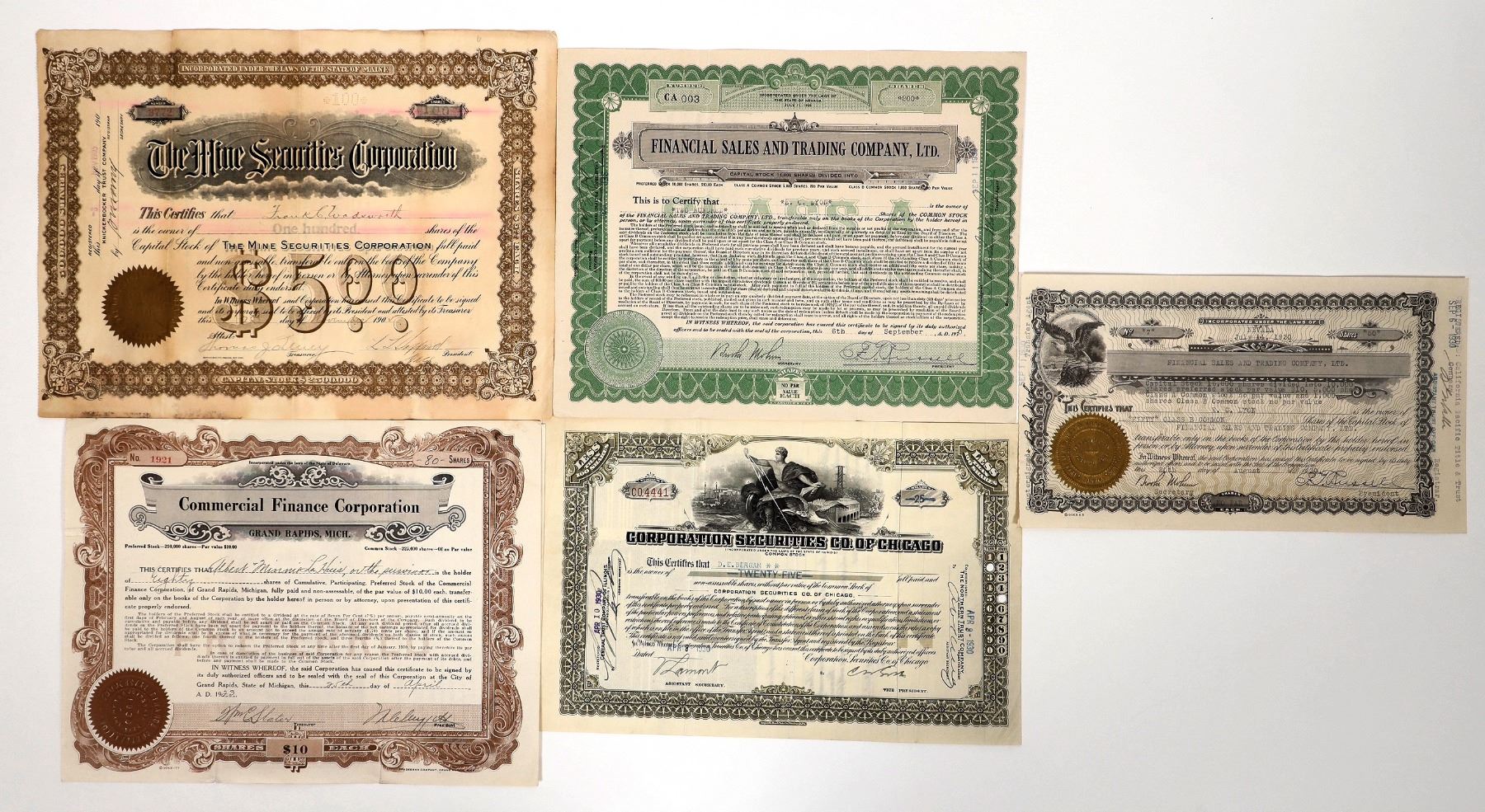 Stock certificates (5) issued by Financial Sales and Trading Company Ltd (2), Commercial Finance Corporation, The Mine Securities Corporation and Corporation Securities Co. of Chicago. All cancelled and in good condition. Please see photos for more details.