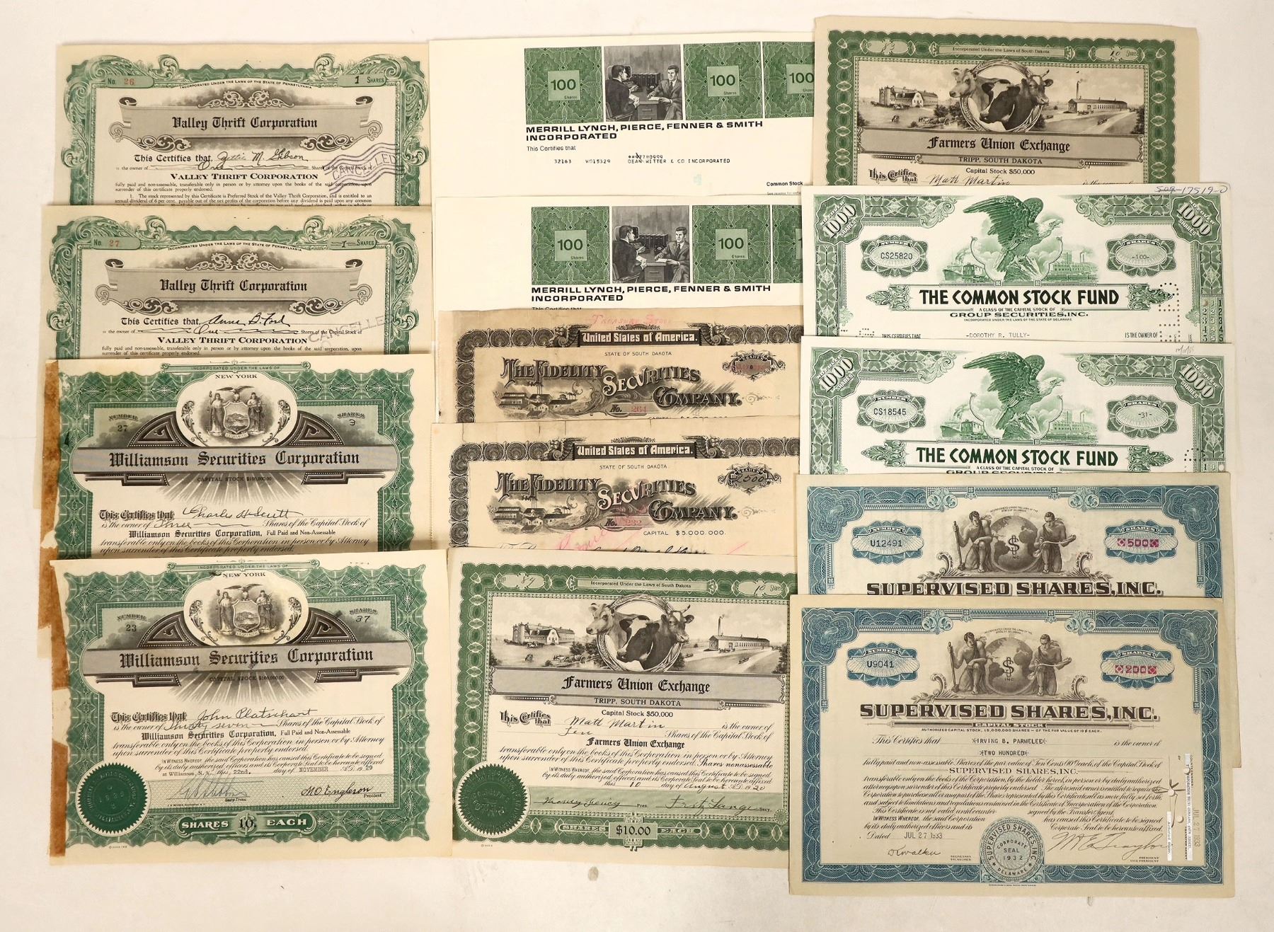 2 each Issued-1929 Williamson Securities, 1971 Merrill Lynch Pierce Fenner and Smith, 1931 Valley Thrift, 1933 Supervised Shares, 1954-56 The Common Stock Fund, 1920 Farmers' Union Exchange, 1903 Fidelity Securities.