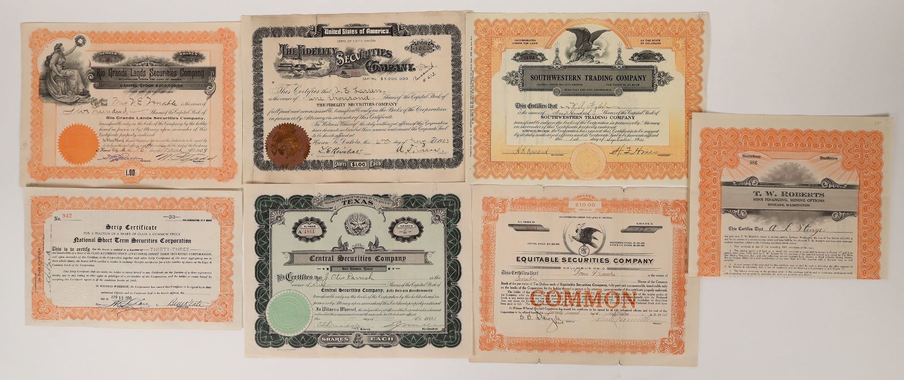 Security company stock certificates (7) included Equitable Securities Company, National Short Term Securities Corporation, Central Securities Company, T.W. Roberts Mine Financing, Southwestern Trading Company, The Fidelity Securities Company and Rio Grande Lands Securities Company. All in good condition. Please see photos for more details. 1900s