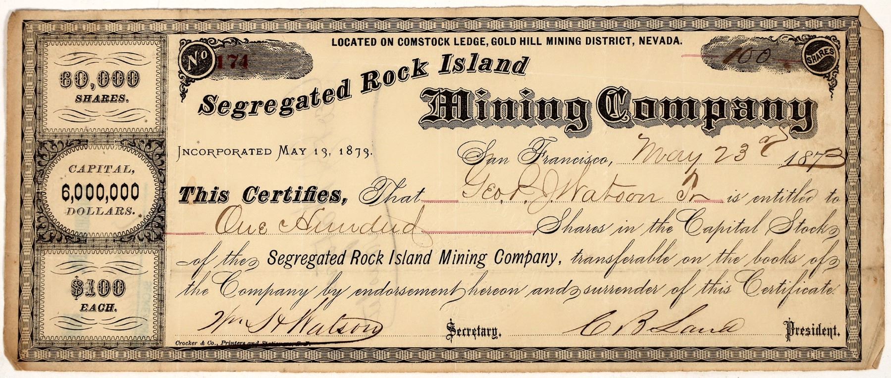 "Located on Comstock Ledge, Gold Hill Mining District, Nevada." printed at top center. No. 174, issued for 100 shares to Geo. Watson in SF in 1873. Signed by president CB Land and secretary Wm. H. Watson. Not cancelled. Black border and print. Folds., some toning. The Rock Island mine was in American Flat next to the Baltimore Consolidated.