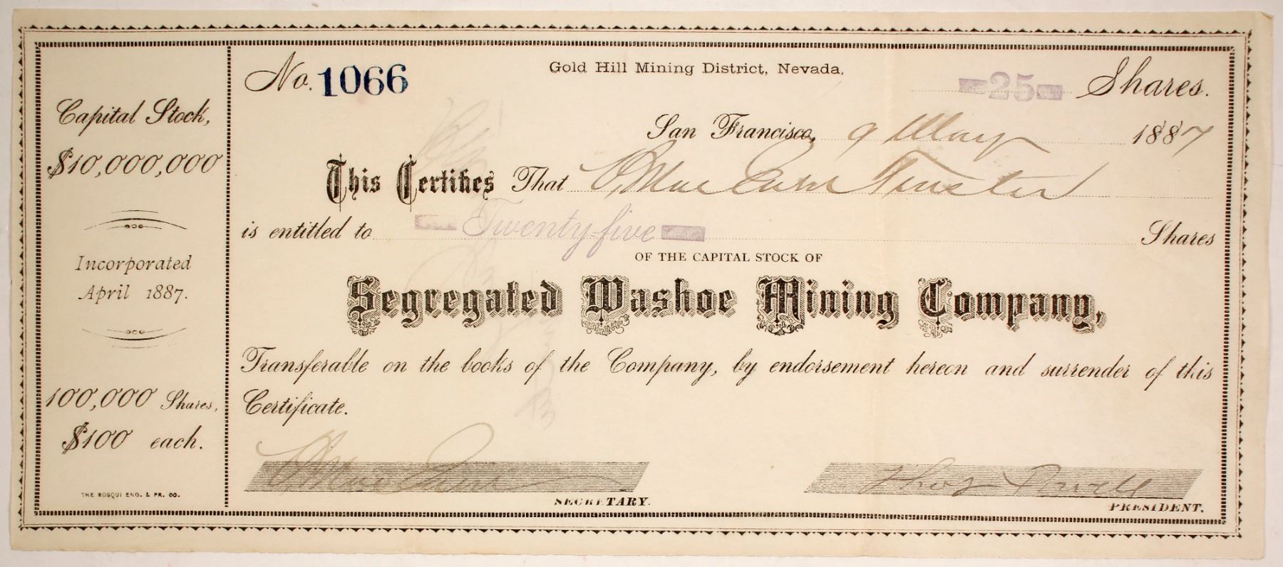 Twenty-five shares of capital stock of Segregated Washoe Segregated Washoe Mining Co., #1066 signed in San Francisco, CA on May 9, 1887 by Thomas Powell, president and M. Ewen, secretary. Plain stock certificate with black ink and border. Incorp. May 9, 1887. Printed: The Rosqui Eng. & PR 00. Ken Prag Collection