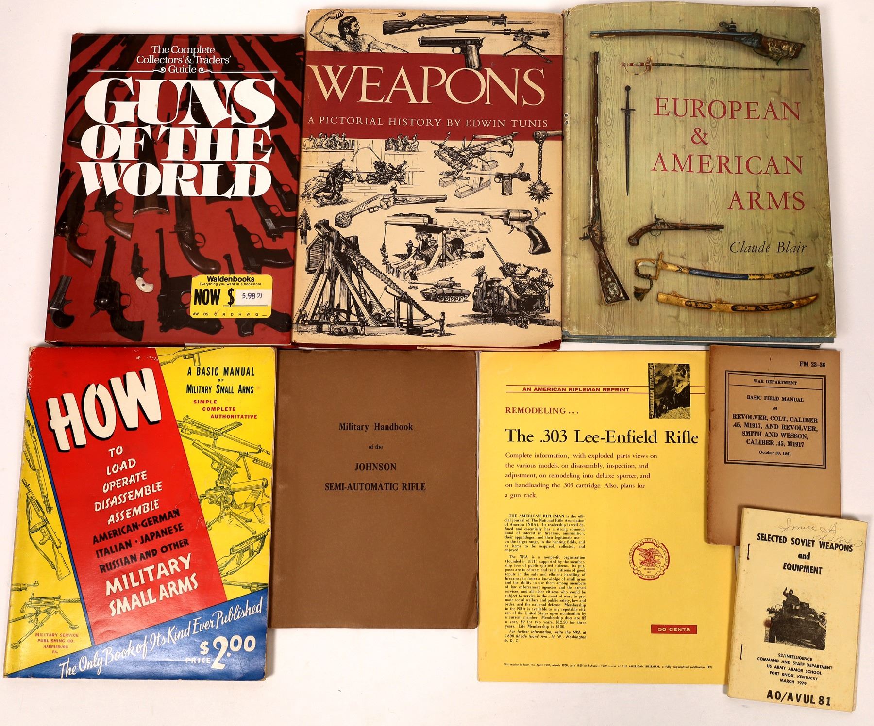 This lot of seven books covers military weapons from around the world. The first book is "Selected Soviet Weapons and Equipment" by S2 Intel. of Fort Knox, dated March 1979. The cover bears the owner's name and number but covers mainly new Russian tanks-the T-64 and T-72. interesting read paperback; War Dept. Basic Field Manual for the Colt revolver and the Smith & Wesson .45 M1917 paperback; the Military Handbook of the Johnson Semi-Automatic Rifle 1938 paperback; How to Load Operate Disassemble Assemble Militray Small Arms by Smith Military service 1943; Weapons a Pictorial History by Tunis first edition 1954 red cloth dust jacket has chips missing; European & American Arms by Blair 1962 light blue cloth cover dust jacket with some small holes on binding; The Complete Collector's guide to Guns of the World 1977 with dust jacket good condition.