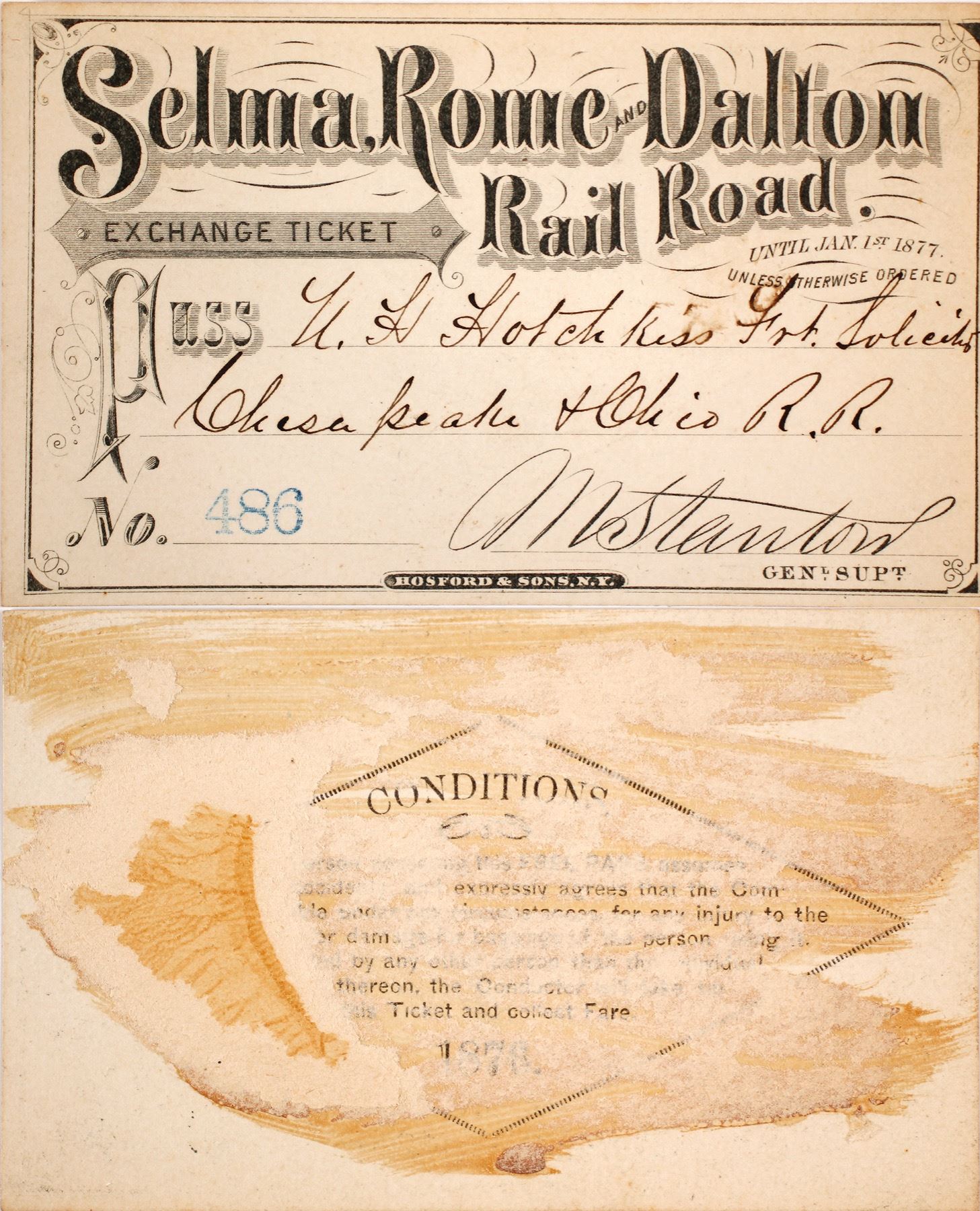 Pass No. 486, issued to NH Hotchikiss (Chesapeake & Ohio Railroad) for the 1876 season. Signed by general superintendent M. Stenton. Printed by Hosford & Sons, NY. Reverse has glue residue. The Selma, Rome and Dalton Railroad Company was formed by the consolidation of Alabama and Tennessee River Rail Road Company, Georgia and Alabama Rail Road Company, and Dalton and Jacksonville Railroad Company on August 6, 1866. (Potter Collection)
