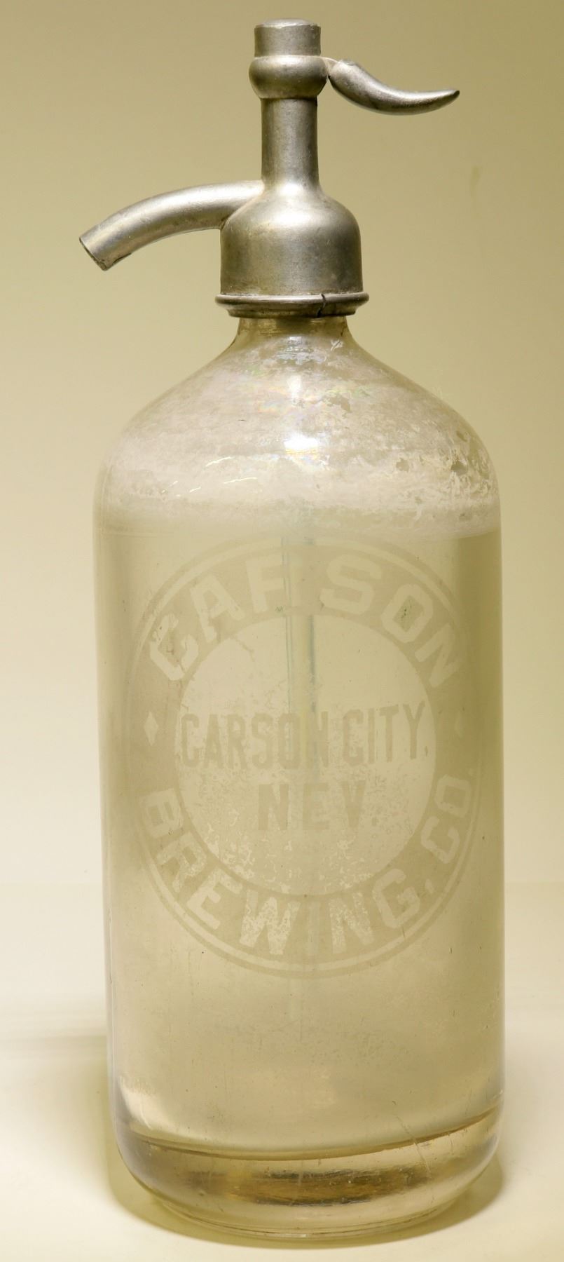 Acid etched on the front of the bottle, in a large circle is : Carson ( cu) / Carson City/ Nev. Brewing, Co( ad ) // Clear , seltzer water bottle, square collar top, tooled lip. 12" Tall, with original metal top. Pretty nice condition. But, in does have a lot of dried contents, that would clean out easy. Minor roughness on base rim , about 3/16", cause this specimen has a unusual base rim. Most bases are flat. Other wise , a very rare item, that's for sure. ( RH). City: Carson City State: Nevada Date: 1890's 1900.