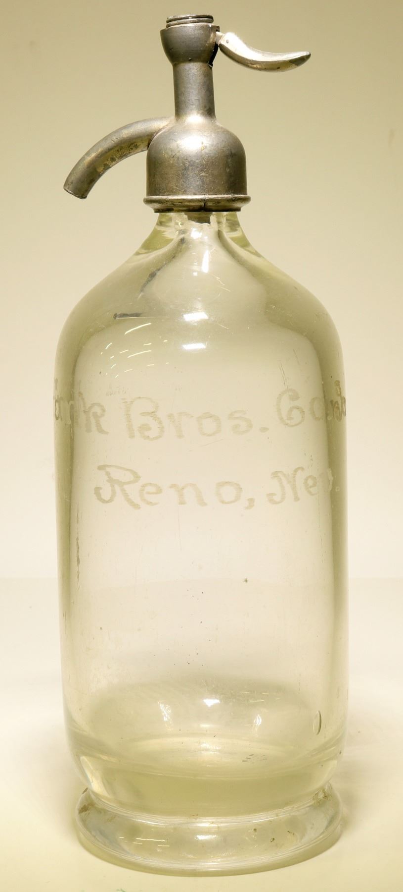Acid etched on the front shoulder of the bottle is : Frank Bros. Co. Inc / Reno , Nev .// Clear, seltzer bottle, with original unembossed top. Top cap missing. Fairly clean bottle with minor haze near the base, and a little dried contents. Perfect condition, except for a minor 3/16" base bruise. Otherwise really nice. ( RH). City: Reno State: Nevada Date: 1890's 1900.