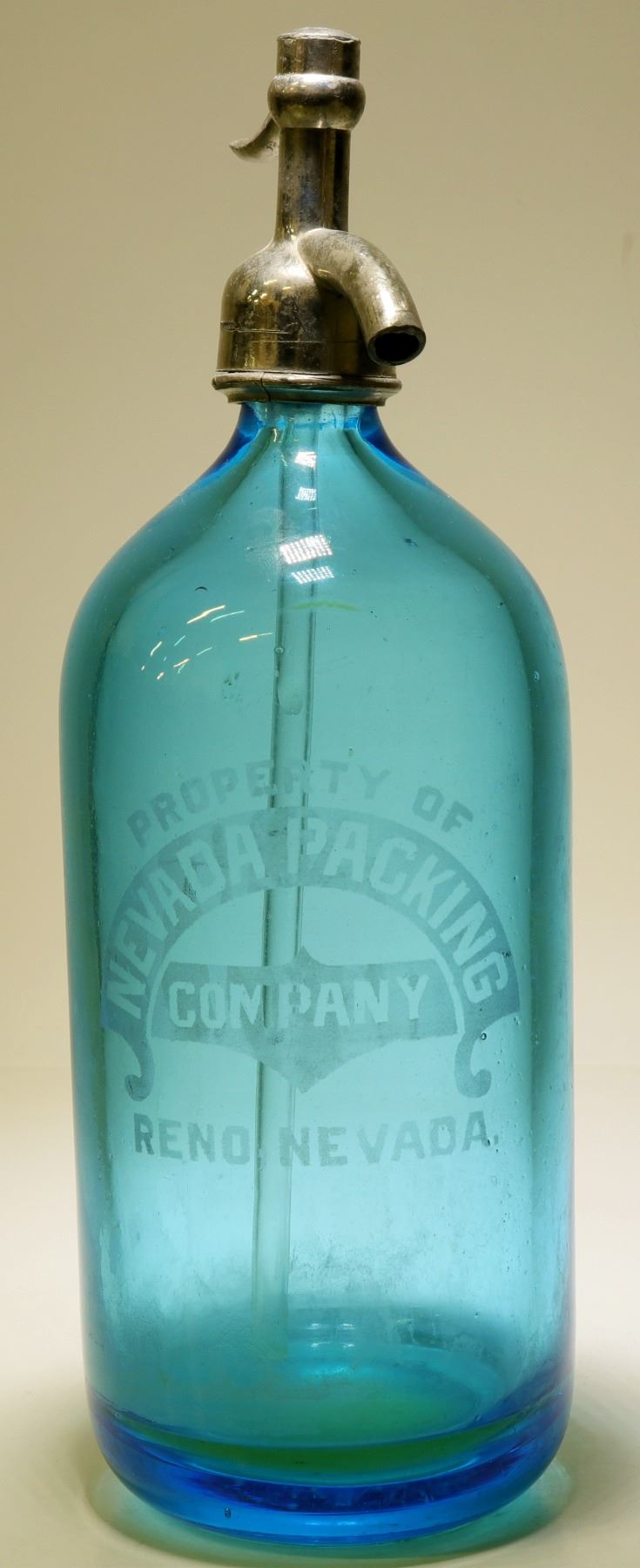 Acid etched on the front of the bottle is: Property Of ( Cu ) / Nevada Packing (au), ( Within a banner)./ Company ( Within a Shield)/ Reno, Nevada // Brilliant peacock blue , seltzer bottle, with matching embossed top. 12" tall, square collar top, tooled lip. Tiny, almost invisible, 1/4" base reflection. Otherwise perfect. Still has condensation and some contents, in the base. Dynamite color...(RH).