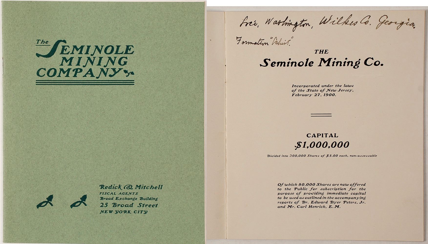 This prospectus is 16 pages. 7 x 6". Like new except that the name of the president has been crossed out and the new president is written in in pencil. Ink on first page shows the location of Washington, Wilkes County, Georgia. No maps or photographs. Redick & Mitchel of New York are the fiscal agents. The mines of the Seminole Mining Company are in the extreme western part of Lincoln County 12 miles northeast of Washington the county seat of Wilkes County and 2 miles east of Metasville the nearest post office The property lies partly in Lincoln and partly in Wilkes counties. The Seminole property was worked for gold from 1852 to 1861 under the name of the Magruder gold mine. It then remained practically inactive until 1880 when mining for gold was resumed and continued until 1884. During the latter period some lead and copper are reported to have been shipped. In 1900 mining was again resumed on the property by the Seminole Mining Company principally for copper and is now being actively carried on. [The Seminole Copper Deposit of Georgia by Watson (Al Adams Gold Rush Memorabilia Collection) Date: c1900 Location: Washington, Georgia HWAC# 57076
