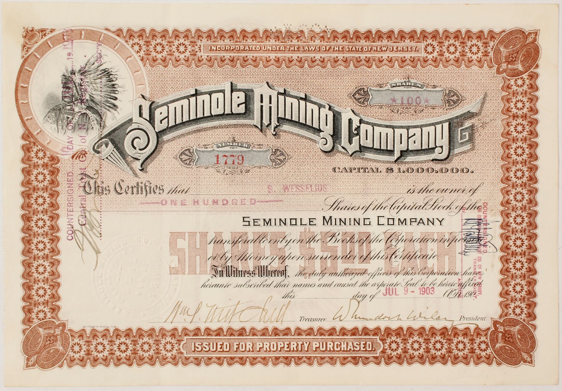 Number 1779 for 100 shares to S Wesselius. Signed by secretary William Mitchell and president W. Wiley. Although mainly regarded as a copper mine, gold was a by-product. United States Geological Survey Bulletin, Issue 455 reports' "The chief copper mine of Georgia is situated on the border between Wilkes and Lincoln counties in the northeastern part of the state, 12 miles from Washington which place is accessible by the Georgia Railroad from Atlanta and Augusta. The mine was visited by the writer in 1904 and was being worked in January 1906." The 1903 Copper Handbook confirms the existence of gold, "7.3% copper, 32% lead, with $4.00 gold and $8.40 silver per ton." More information on the mine is included. Hole punched "100" for shares of stock. Not cancelled. No rips, edge issues, staining, pin holes or dog ears.