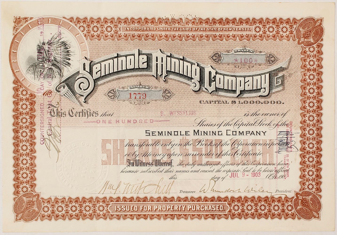 Number 1779 for 100 shares to S Wesselius. Signed by secretary William Mitchell and president W. Wiley. Although mainly regarded as a copper mine, gold was a by-product. United States Geological Survey Bulletin, Issue 455 reports' "The chief copper mine of Georgia is situated on the border between Wilkes and Lincoln counties in the northeastern part of the state, 12 miles from Washington which place is accessible by the Georgia Railroad from Atlanta and Augusta. The mine was visited by the writer in 1904 and was being worked in January 1906." The 1903 Copper Handbook confirms the existence of gold, "7.3% copper, 32% lead, with $4.00 gold and $8.40 silver per ton." More information on the mine is included. Hole punched "100" for shares of stock. Not cancelled. No rips, edge issues, staining, pin holes or dog ears. (Al Adams Gold Rush Memorabilia Collection) Date: 1903 Location: Wilkes County, Georgia HWAC# 56924