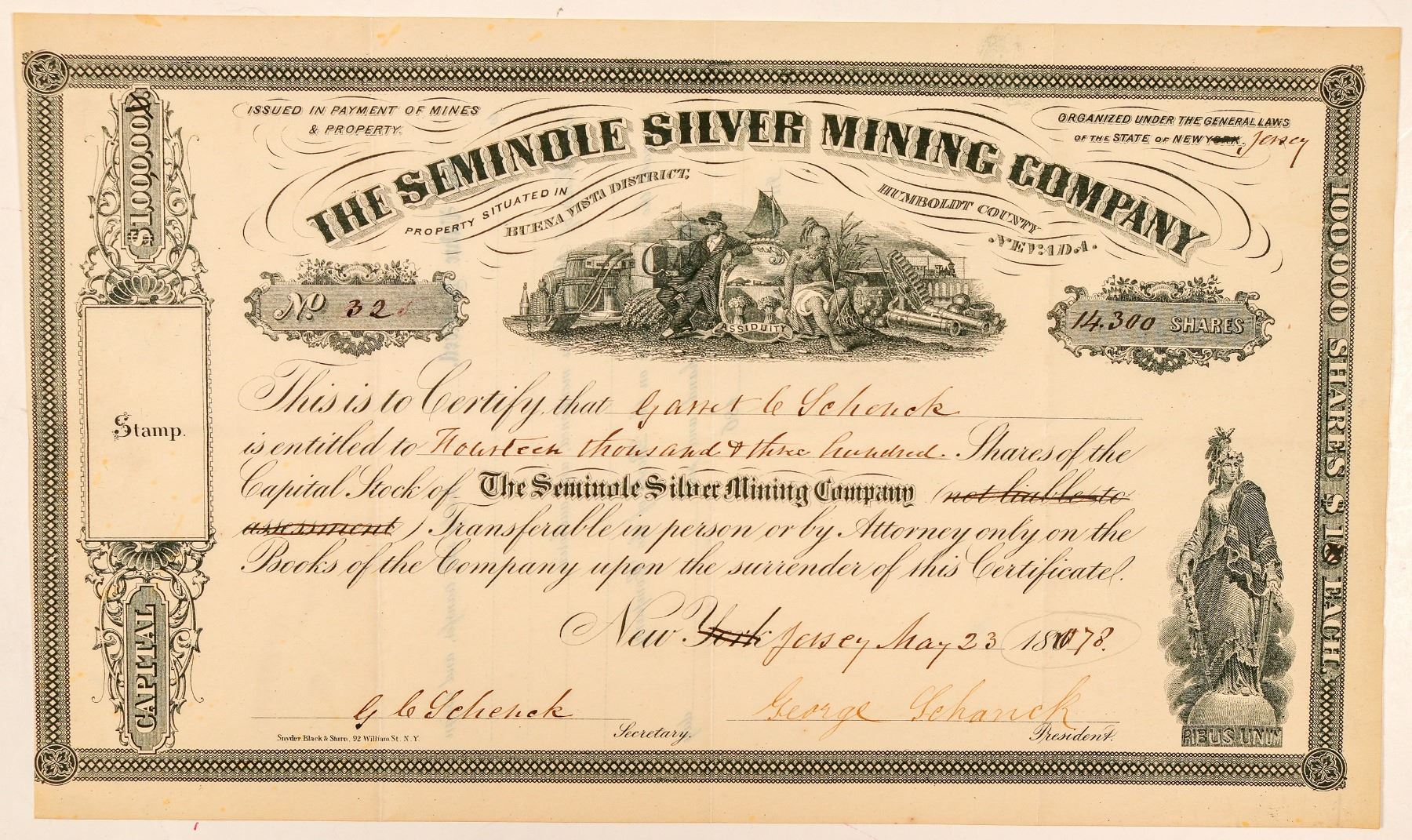 Property situated in Buena Vista District, Humboldt County, Nevada (printed above vignette). Inc. in New Jersey (New York crossed out). No. 32, issued for 14,300 shares to Janet Schenck on May 23, 1878. Signed by president George Schenck and secretary GC Shenck. Not cancelled. Black border and print. Two allegorical vignettes. Folds, light other wear. 6.5 x 11" According to an archive of Seminole Silver Mining Co. material at Yale, the mine was at Unionville. It appears they owned the Sunset Lode. Not listed in Filer or Holabird indexes. Ken Prag Collection