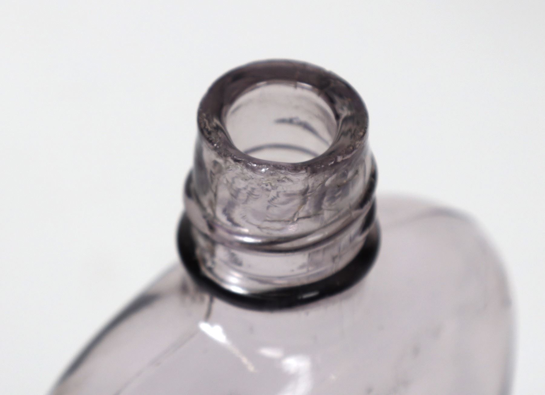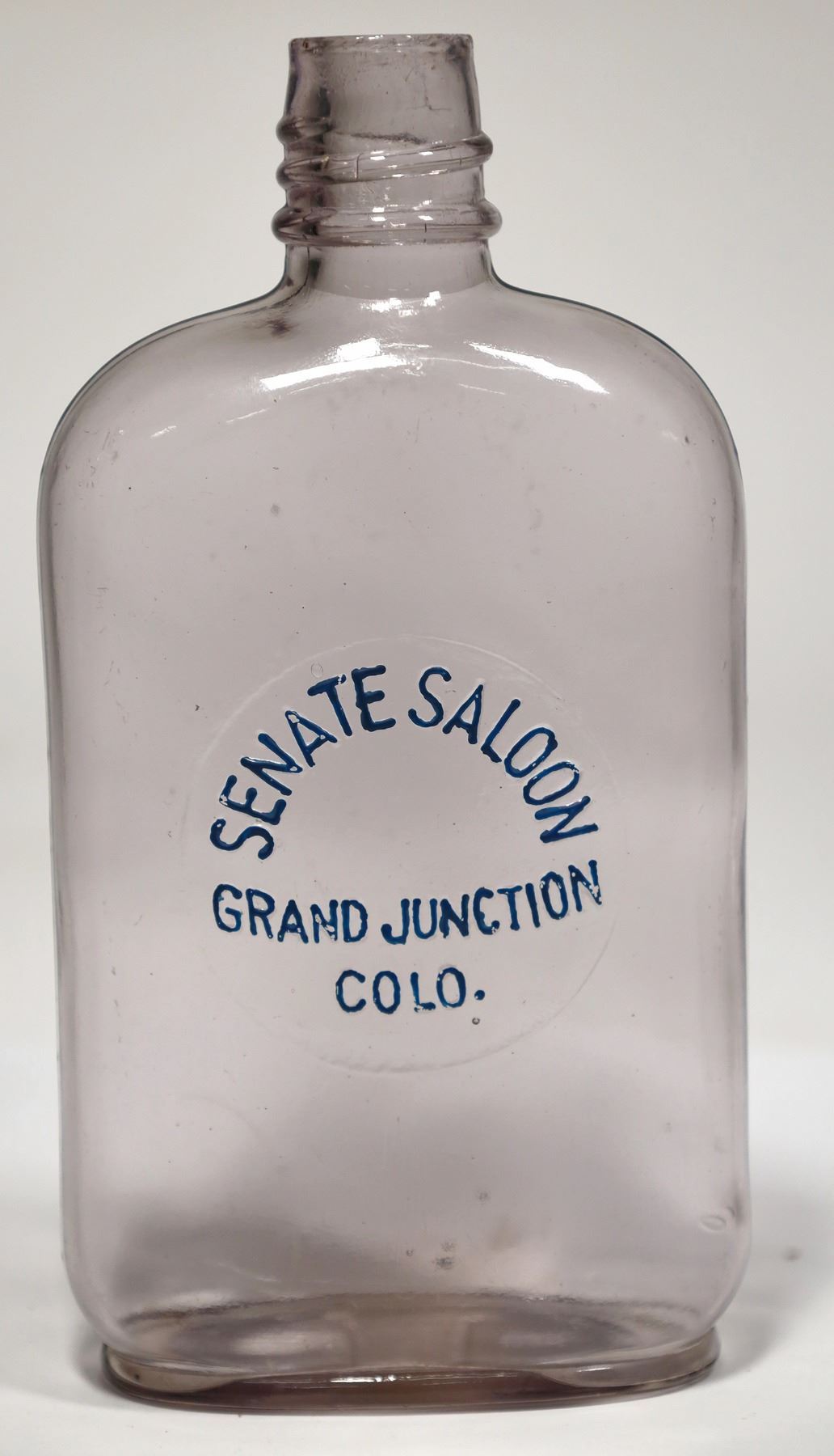 Preble W-93. Senate Saloon / Grand Junction / Colo. Blue lettering. 6.25" pocket flask, very light purple tint. Chips along lip, bubbles. Very attractive bottle!
