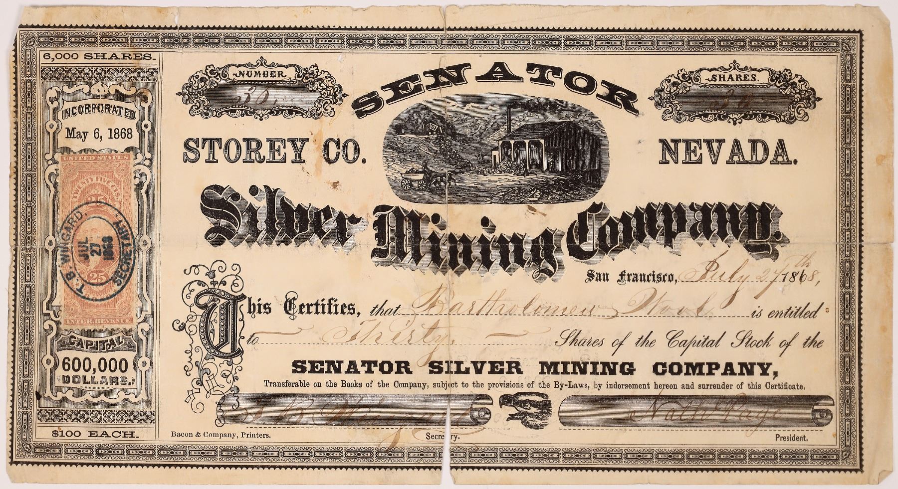 Senator Silver Mining Company - Virginia City, NV - Storey County Certificate dated July 27, 1868 - Comstock region. Incorporated in 1868 and capitalized at $600,000; 6,000 shares at $100 per. Certificate No. 36 for 30 shares issued to Bartholomew Wood. Signed by Nash Page, President, and T.B. Wingard, Secretary. Red Brown twenty-five cent Washington Internal Revenue Bondstamp. Printer: Bacon & Company. Uncancelled. Vignette of mine site at center, and eagle's head at bottom. Meas. 5.25 x 9.5 inches. Black print on creme paper. Central crease with tearing has tape reinforcement on reverse. Some staining. Foxing and yellowing with tears along the edges and stains on front and back. Fair condition.