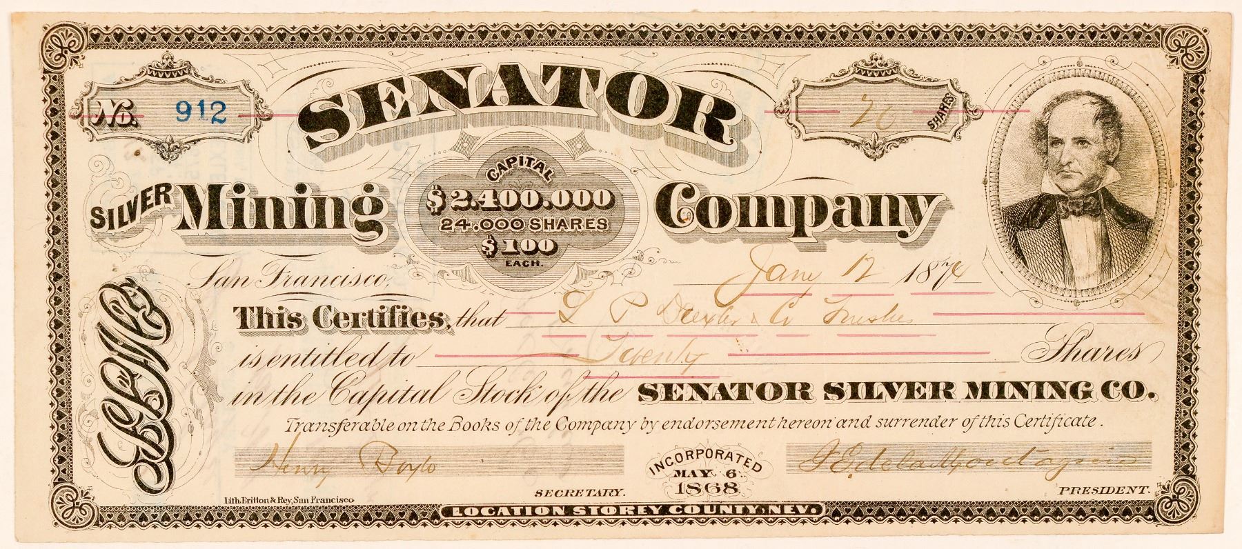 Location: Storey County, Nev. (printed at bottom center). Inc. May 1868. No. 912, issued for 20 shares to L.P. Dexter & Co., trustee, on Jan. 12th, 1870. Signed by president J.E. de la Montagnie and secretary Henry Boyle. Not cancelled. Black border and print. Vignette at upper right of a well-dressed man who looks like Senator James Nye. Nye was a Nevada senator during this period (1868-70). It doesn't look like pictures of William Ralston, William Stewart, William Sharon, James Fair, etc. As one of the first two senators from Nevada, we would expect it be either Nye or Stewart. Printed by Britton & Rey, SF. 4 x 9.5" Pinholes, folds, clean. Not in Filer. Joseph E. de la Montagnie is listed as a contractor in the 1871 SF directory. Henry Boyle is listed as a mining secretary. L.P.Drexler & Co. were stock brokers in Virginia City and San Francisco. According to an article in the Sacramento Daily Union, July 6, 1868, "this company proposes to carry on the business of mining on the Neagle & Corcoran lode, Storey County, Nevada." 1876 articles list it as the Virginia Mining District. There is also a "Senator Mining Company" listed in the Pacific Coast Annual Mining Review, 1878, pg. 241: located next to the Julia and east of the Chollar-Potosi, dating back to 1862. () Ken Prag Collection