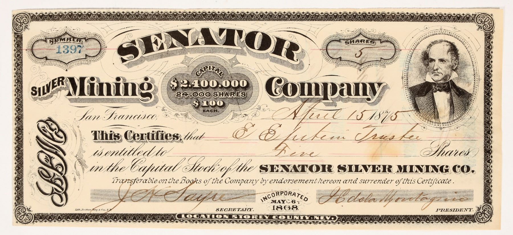 Location: Storey County, Nev. (printed at bottom center). Inc. May 1868. No. 1397, issued for 5 shares to E. Epstein, trustee, on April 15th, 1875. Signed by president J.E. de la Montagnie and secretary JH Sayre. Not cancelled. Black border and print. Vignette at upper right of a well-dressed man who looks like Senator James Nye. Nye was a Nevada senator during this period (1868-70). It doesn't look like pictures of William Ralston, William Stewart, William Sharon, James Fair, etc. As one of the first two senators from Nevada, we would expect it be either Nye or Stewart. Printed by Britton & Rey, SF. 4 x 9.5" Pinholes, folds. Not in Filer. Joseph E. de la Montagnie is listed as a contractor in the 1871 SF directory. According to an article in the Sacramento Daily Union, July 6, 1868, "this company proposes to carry on the business of mining on the Neagle & Corcoran lode, Storey County, Nevada." 1876 articles list it as the Virginia Mining District. There is also a "Senator Mining Company" listed in the Pacific Coast Annual Mining Review, 1878, pg. 241: located next to the Julia and east of the Chollar-Potosi, dating back to 1862.