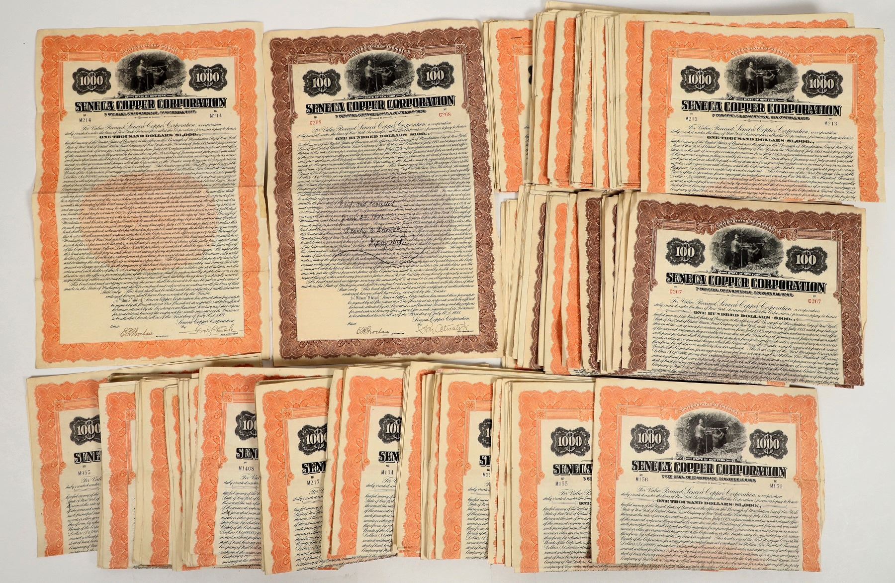 This group of bonds were issued by Seneca Copper Corporation in 1923. There are over 190 bonds in this lot. Some bonds are $100 issues while others are $1000 issues. Please see photo for details.