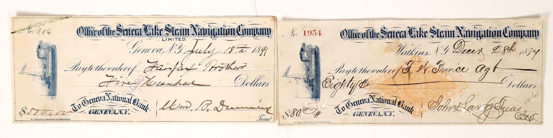 2 Seneca Lake Steam Navigation Co checks, c. 1874 with RNG and 1891 with steamer vignette. New York Geneva