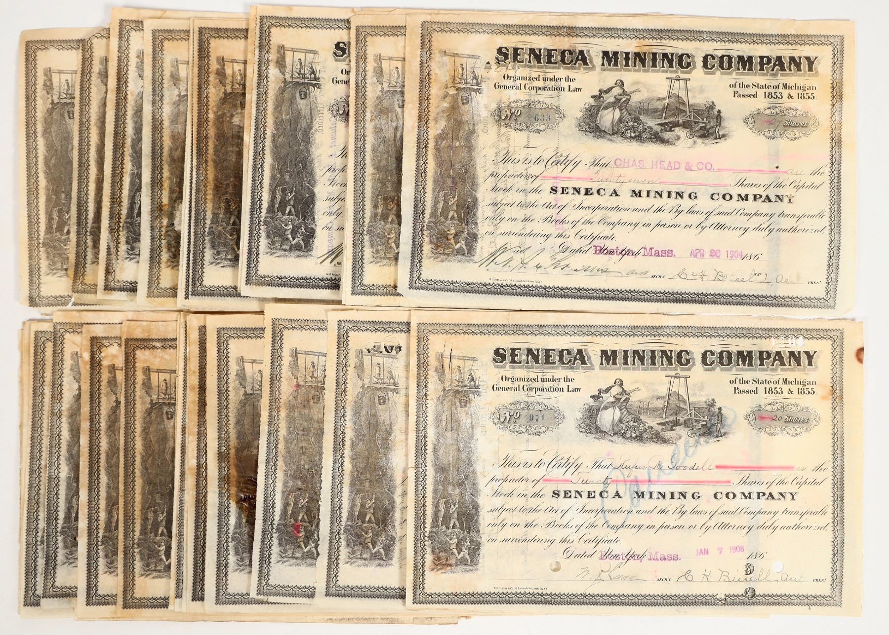 About 35 stock certificates issued by Seneca Mining Company circa 1910. Mining vignettes, 12 x 8 inches.