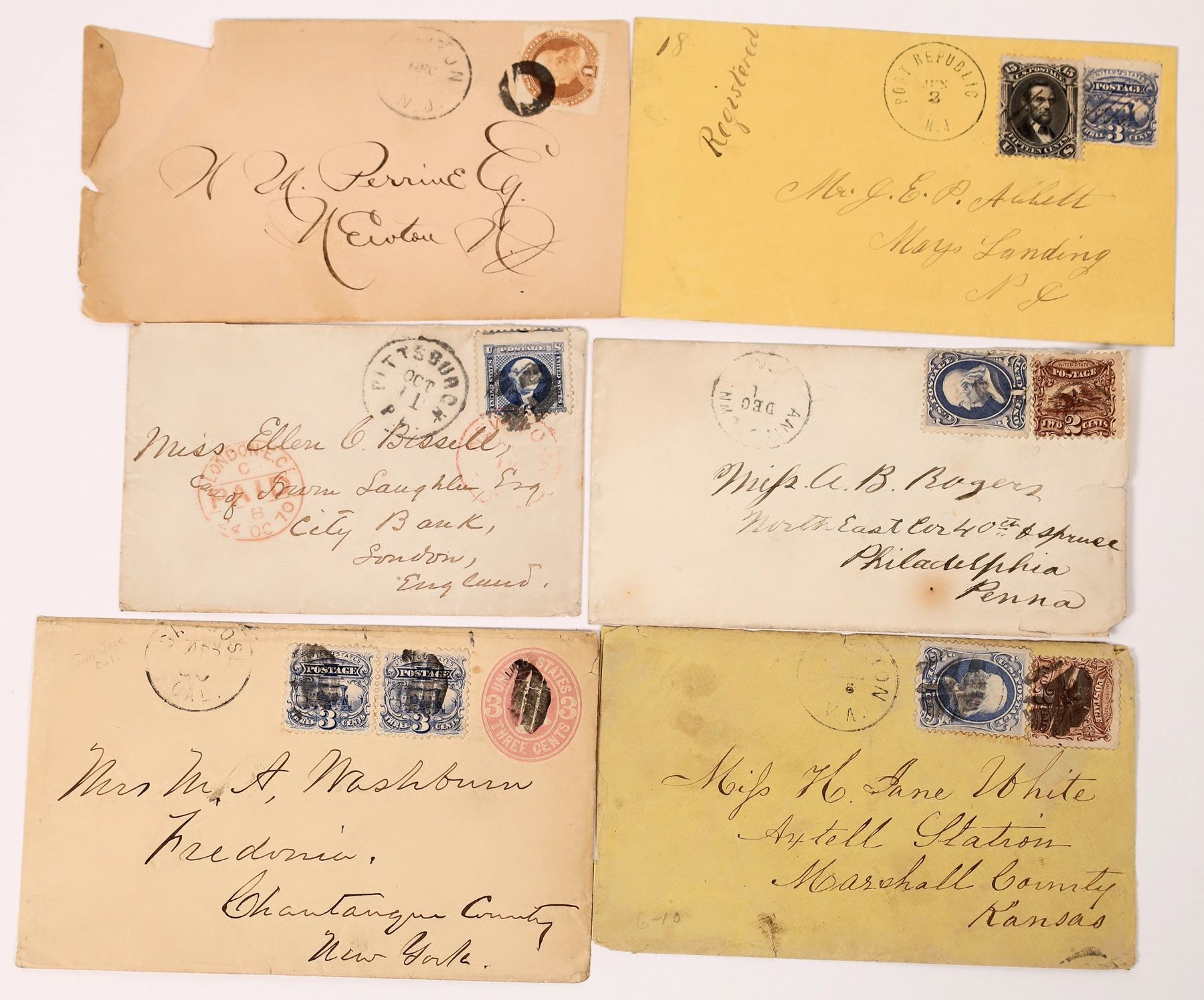 6 covers with 1869 series stamps. A34 1 cent, A36 3 cents, A33 15 cents, 2x A35 2 cents, A37 6 cents, off center.
