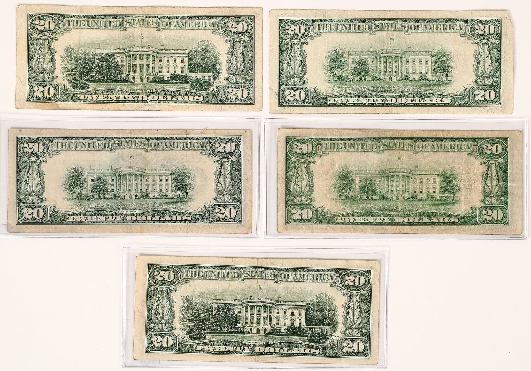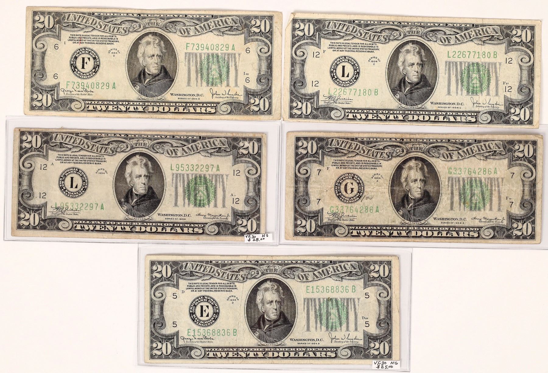 Lot of five $20 bills made in the series of 1934. Can't find them in circulation anymore! Series of 1934; 1934A; 1934C; 1934D(2). Mostly VF condition. $100 face value.