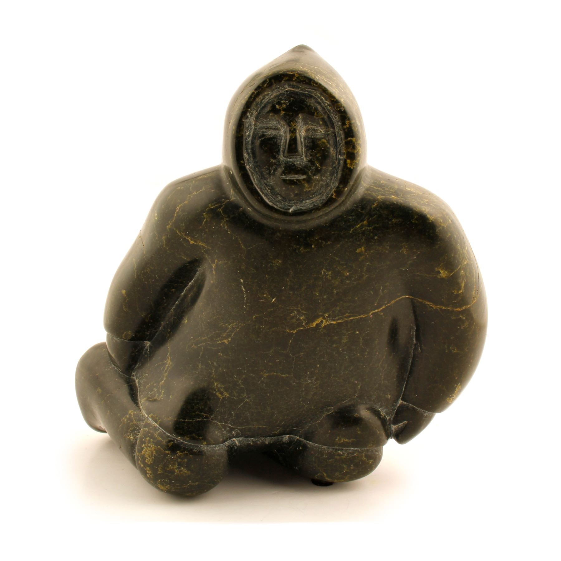 Native Alaskan serpentine stone carving of Eskimo kneeling down. Very dense, dark green, rock. Smooth, beautifully detailed face. Signed by artist, tribal signature, no. E5294. 12.4 Lbs., 8.5" x 9.5". From the Ben-Tchavtchavadze collection of Ontario, Canada. State: Alaska City: Date: HWAC# 83537