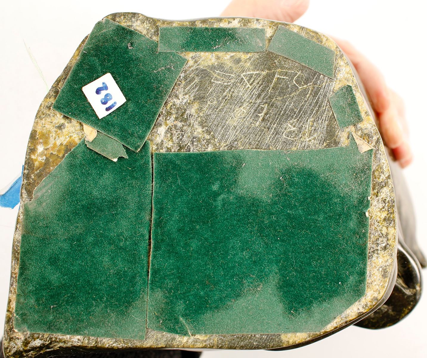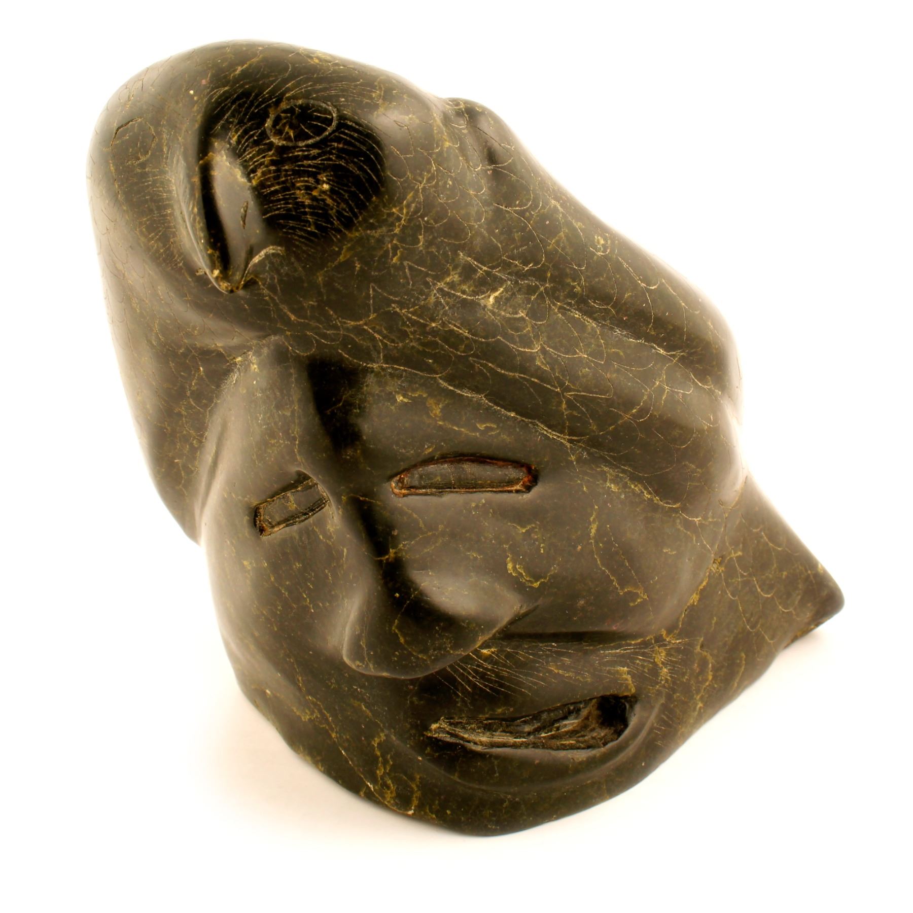 Native Alaskan serpentine stone carving with owl on top of head that is grimacing. Very dense, dark green, serpentine. Beautiful work of art. Smooth, detailed feathers on owl. This carved stone has tribal writing & numbers at bottom of base on underside. Beautiful piece. 15.4 LBS., 7" x 8.5". State: Alaska City: Date: HWAC# 83536