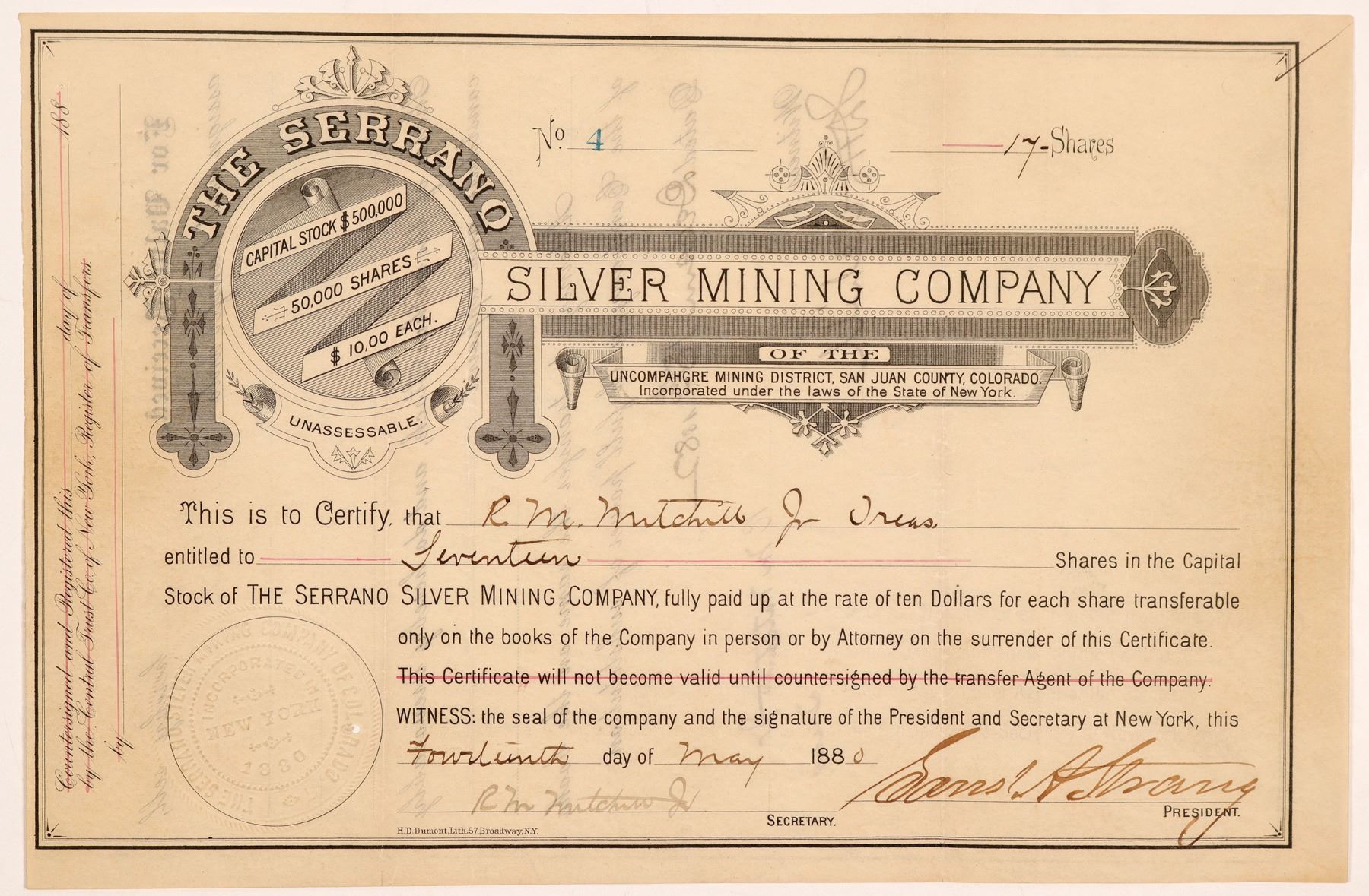 "of the Uncompahgre Mining District, San Juan County, Colorado" (printed under title). Inc. in New York. Low number 4, issued for 17 shares to treasurer RM Mitchell Jr. on May 14th, 1880. Signed by president Strong and Mitchell as secretary. Not cancelled. Simple design with no vignette but ornate company logo. Printed by HD Dumont, NY. Folds, pinholes, toning. 6.5 x 10" Not listed in Corbett (1879), Fossett (1880), or Corregan & Lingane (1883). E&MJ Vol. 35 (1883) mentions a Serrano Silver Mining Co. working the Serrano Lode in the Lake City District of Colorado. Ken Prag Collection