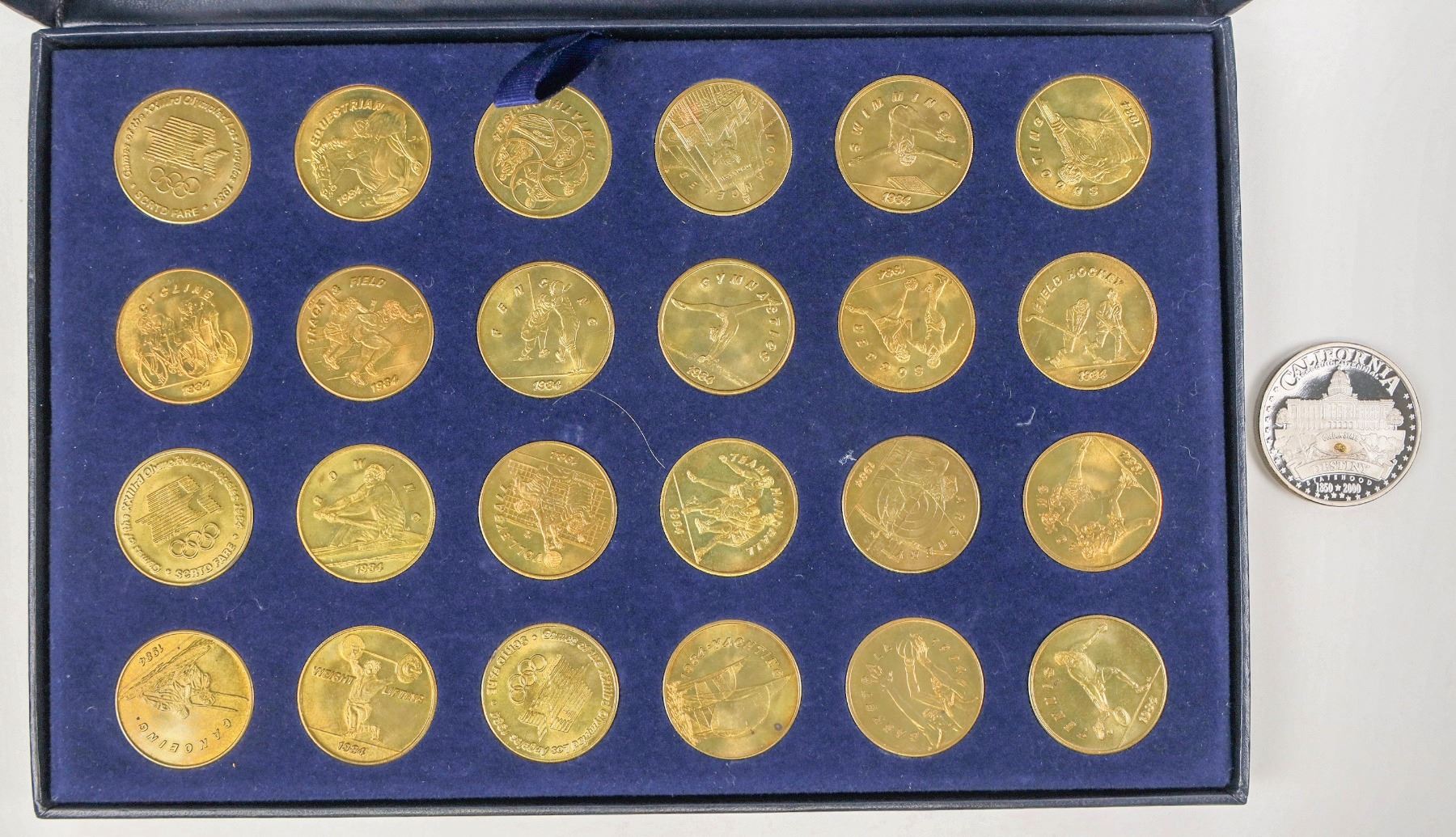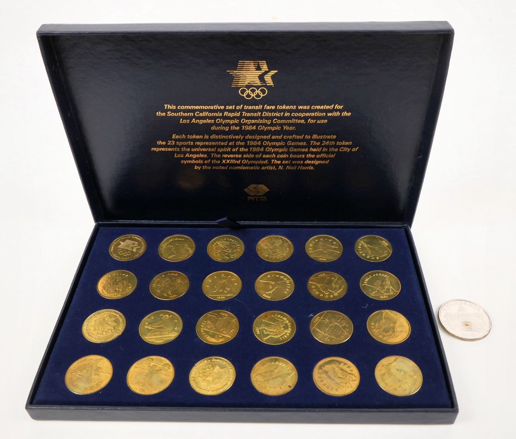 Northwest Territorial Mint's 2000 one ounce .999 silver proof Sesquicentennial coin (39 mm) with an authentic gold nugget mined from historic California gold fields. Also a commemorative set of transit fare tokens created for the Southern California Rapid Transit District for use during the 1984 Olympic Year. Twenty four bronze tokens designed by N. Neil Harris. In original case.