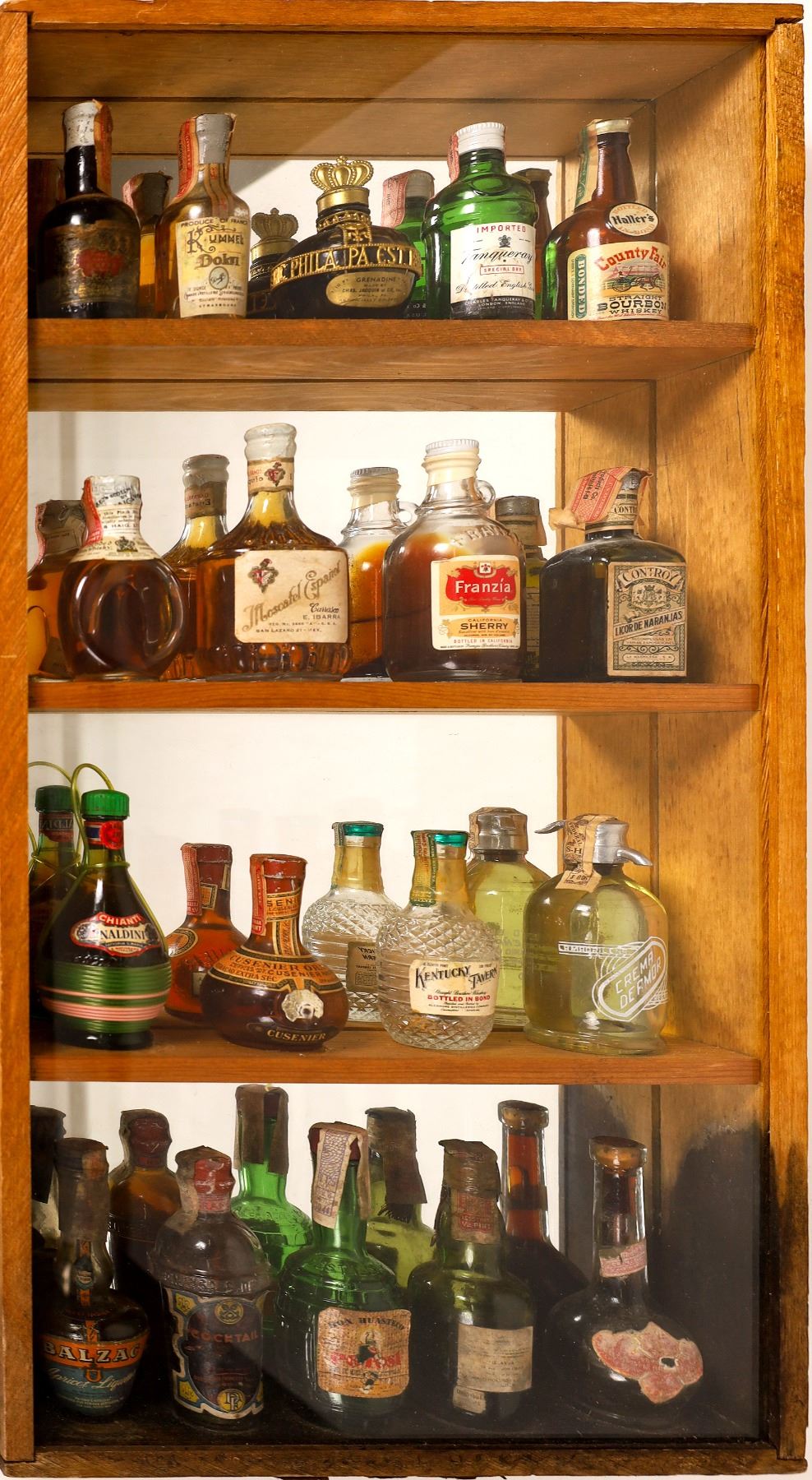 Approximately 205 mini liquor bottles, many with original contents inside and revenue stamps attached, all displayed in twelve, custom-made, mirror-backed, wooden display cabinets, nominally 12 x 24.5 inches and between 2.25 and 3.75 inches thick, depending on the bottles inside. Both foreign and domestic products are represented and include gin, whiskey, bourbon, tequila, rum, curacao, sherry, creme de menthe, aperitifs, wine (white, rose, red), fruit liqueur, brandy, vermouth, vodka, cognac, martini, cordial, anisette, and even beer and other stuff. We've not seen as extensive and diverse a collection come in like this before. Please see photos for detail and condition. NOTE: this collection will require special shipping arrangements due to the nature and condition of the items. Personal pickup of this item at our office is strongly recommended.