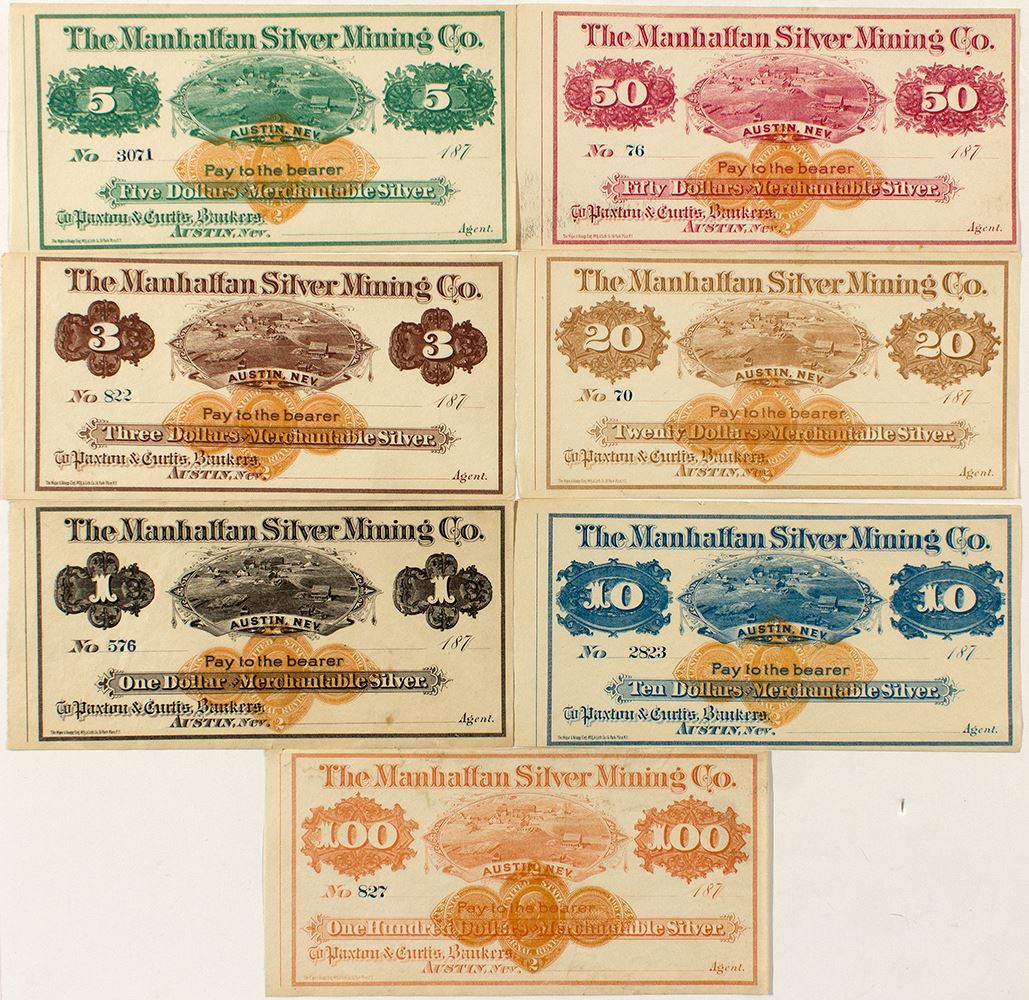 Seven different denominations of this colored scrip: $1, $3, $5, $10, $20, $50, $100. All different colors. All RN-D1. Mining vignette. Unissued. Excellent set!