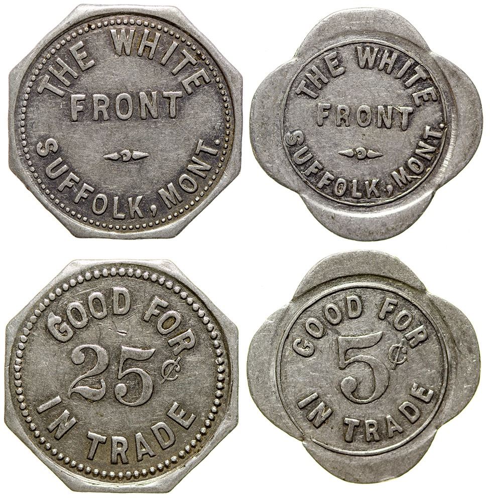 R-7. The White / Front / Suffolk, Mont. // GF / 5c (scalloped (4), aluminum, 25mm), 25c (octagonal, aluminum, 25mm) / IT. (Svoboda Collection) City: Suffolk State: Montana Date: HWAC# 35065