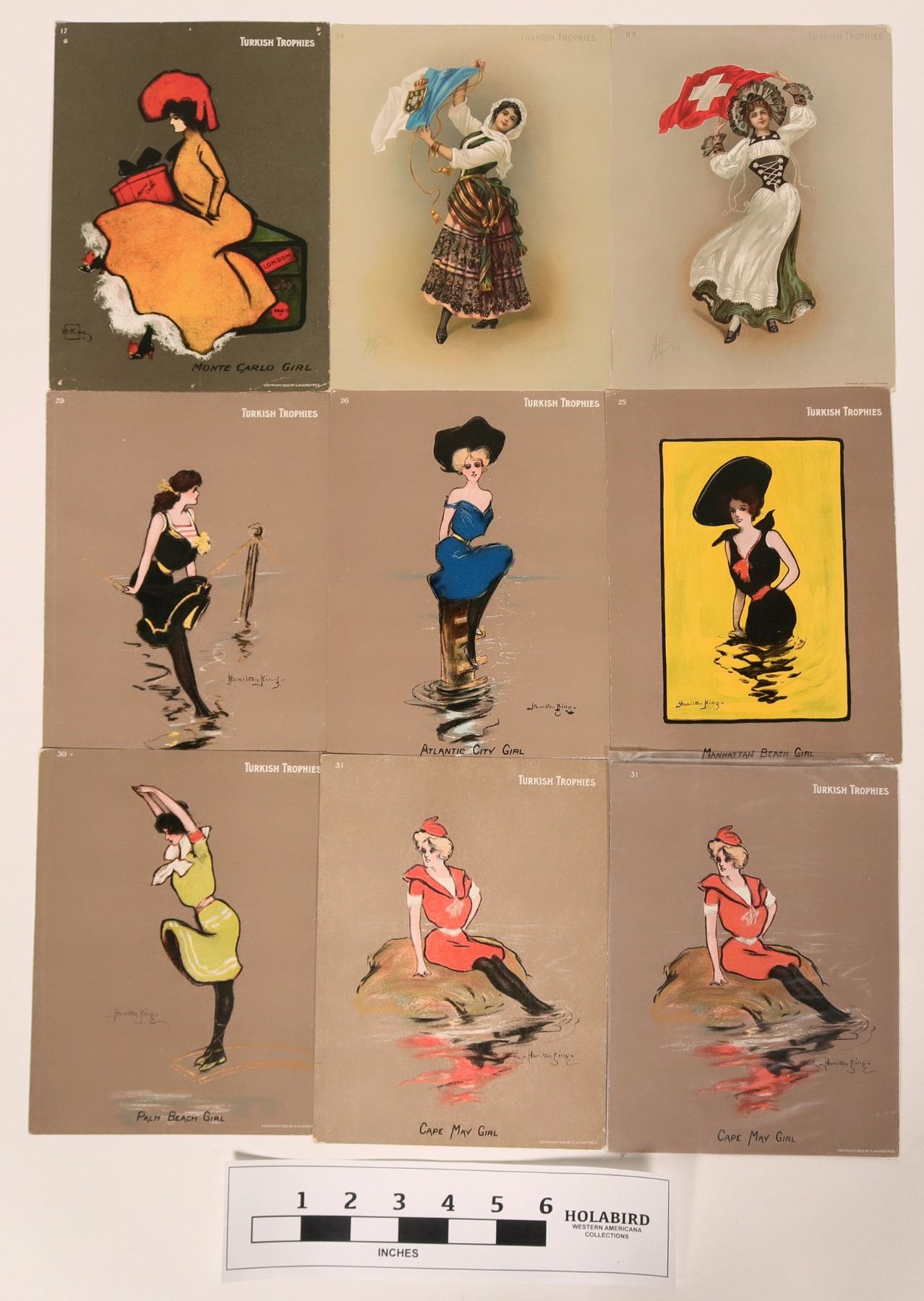 Set of nine 6 x 8 inch prints, colorful works of art, that were given in exchange for coupons received upon buying "All Turkish Tobacco" cigarettes, copyright 1902 and 1903. Below advertisement on the backs reads, "FOR A LIMITED TIME A COMPLETE SET OF 25 PICTURES MAY BE SECURED ON RECEIPT OF 100 COUPONS. (signed) S. Anargyros, N.Y." Fronts feature the words, "TURKISH TROPHIES," and paintings of women around the world and in various locations of the U.S., with artists' signatures. See photos for details.