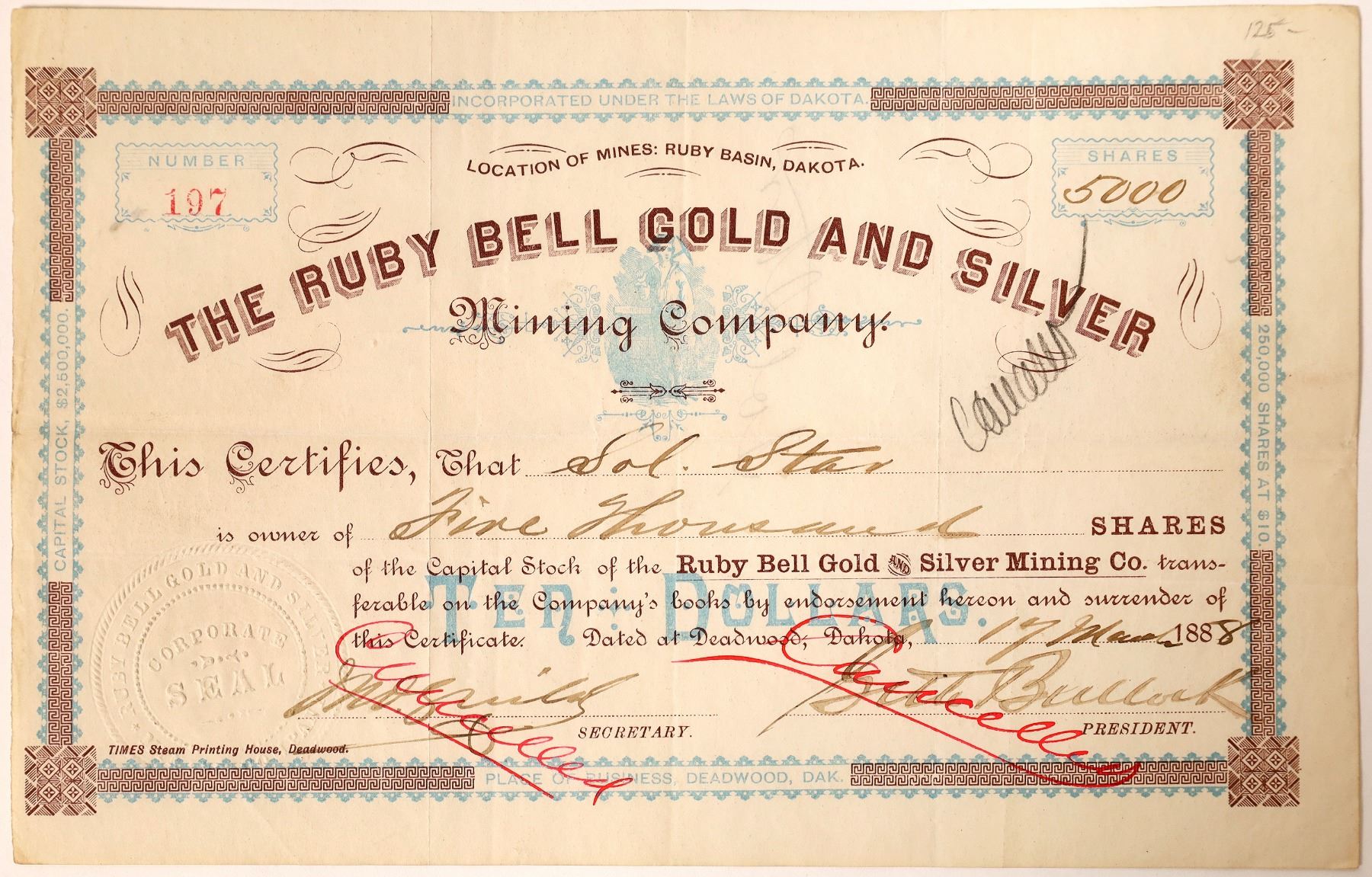 Strong, bold signature. ‘Cancelled’ in red over signature. # 197 for 5000 shares to Sol Star and endorsed on back. Dateline Deadwood, Dakota, 1888. Underprint blue miner. Light issues at edges, overall very nice. Bullock, Seth was the first sheriff of Deadwood, Dakota and an U.S. Marshall. Deadwood was a lawless area sated with rough characters. The day after She Star and Bullock arrived, Jack McCall shot folk legend and lawman Wild Bill Hickok in the back of the head. Before he unpacked, the angry townspeople elected Bullock as their first sheriff. He brought law and order to the city with strength of character more than bullets. In addition to bringing peace, he played an important role in the development of the town by investing in its mines, farms, ranches, and cultural development. Solomon Star was a German-American businessman and politician notable as an early resident of the town of Deadwood, South Dakota. He was mayor of Deadwood at the time this certificate was issued.