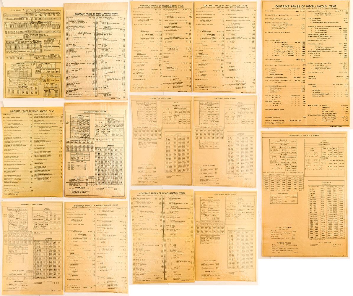 16.25" x 11". Clear laminated 2 sided paper from 1963-1961 listing prices for timber, cribbing, pipe, slushers and more. HWAC# 50271 Date: Location: