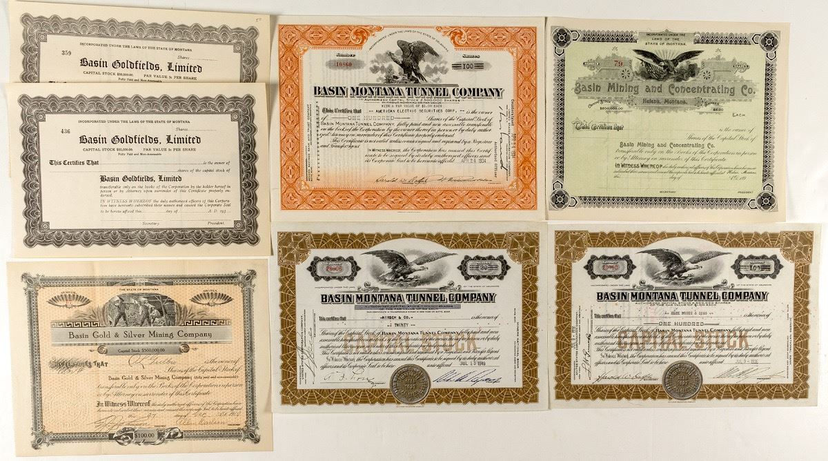 Four issued: 3 Basin Montana Tunnel Co., no. 20750, 100 shares, 1936, no. 10860, 100 shares, 1934, and no. 269 06, 20 shares, 1949; Basin Gold and Silver Mining Co., no. 67, 10 shares, 1919. Three unissued: Basin Mining and Concentrating Co., no. 79; two Basin Goldfields, Limited, nos. 359, 463. City: Basin State: Montana Date: ID: 36627