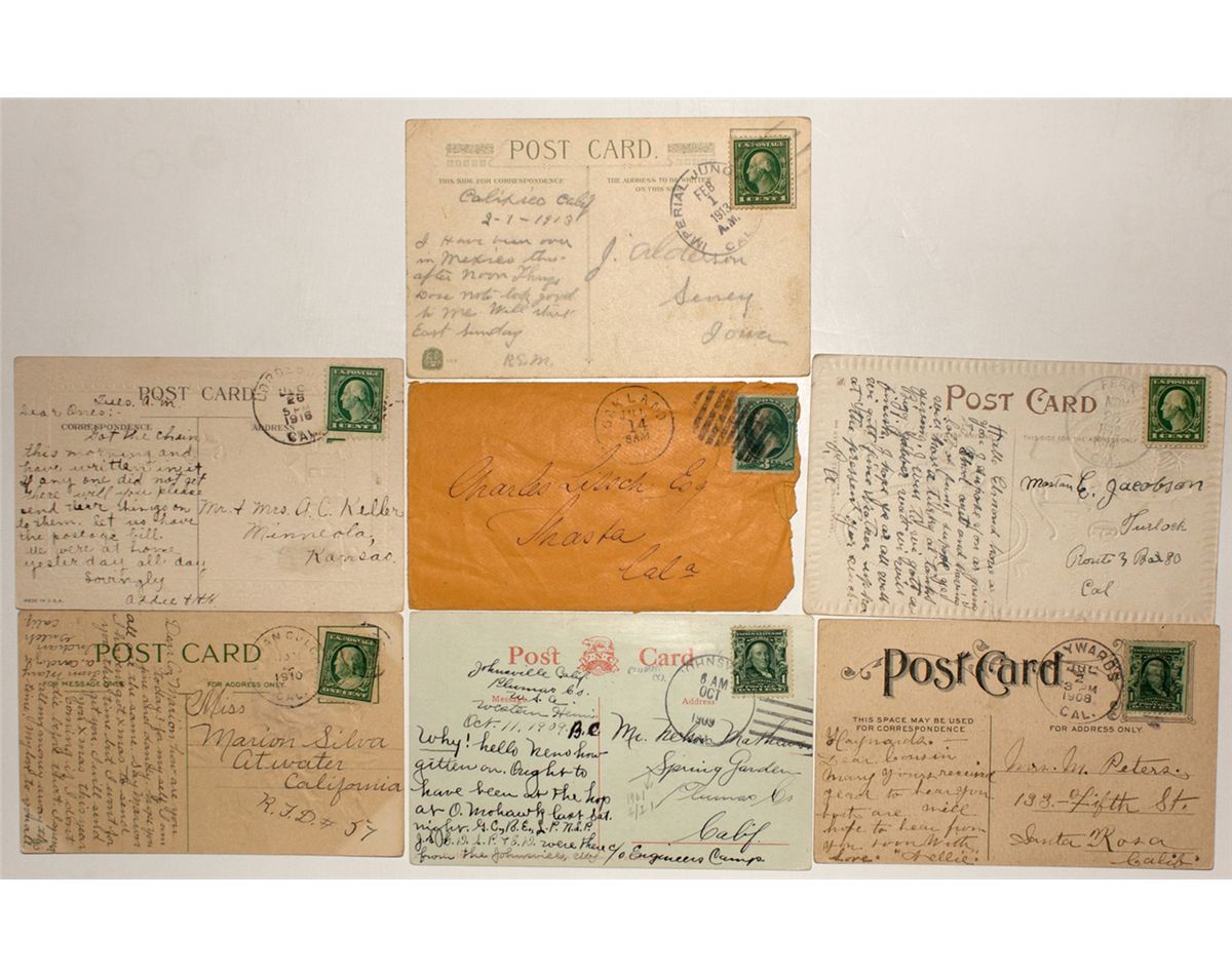 1909 Jonesville, 1912 Fern, 1913 Imperial Junction, 1910 Indian Gulch, early Oakland, 1916 Lordsburg(?) and 1908 Haywards. All on post cards but early Oakland. Date c1910 , CA hwac 2208