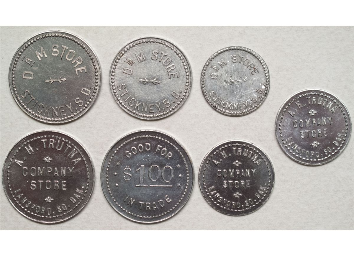 1) Set of two AB Trutna Company store tokens. Lansford SD. (Actually this is a North Dakota token.) Two different denominations: 25c and $1.00. 2) Same as 1. 3) Set of three DrM tokens. Includes the $5.00 token. Stickney, SD. Date: SD hwac 2267