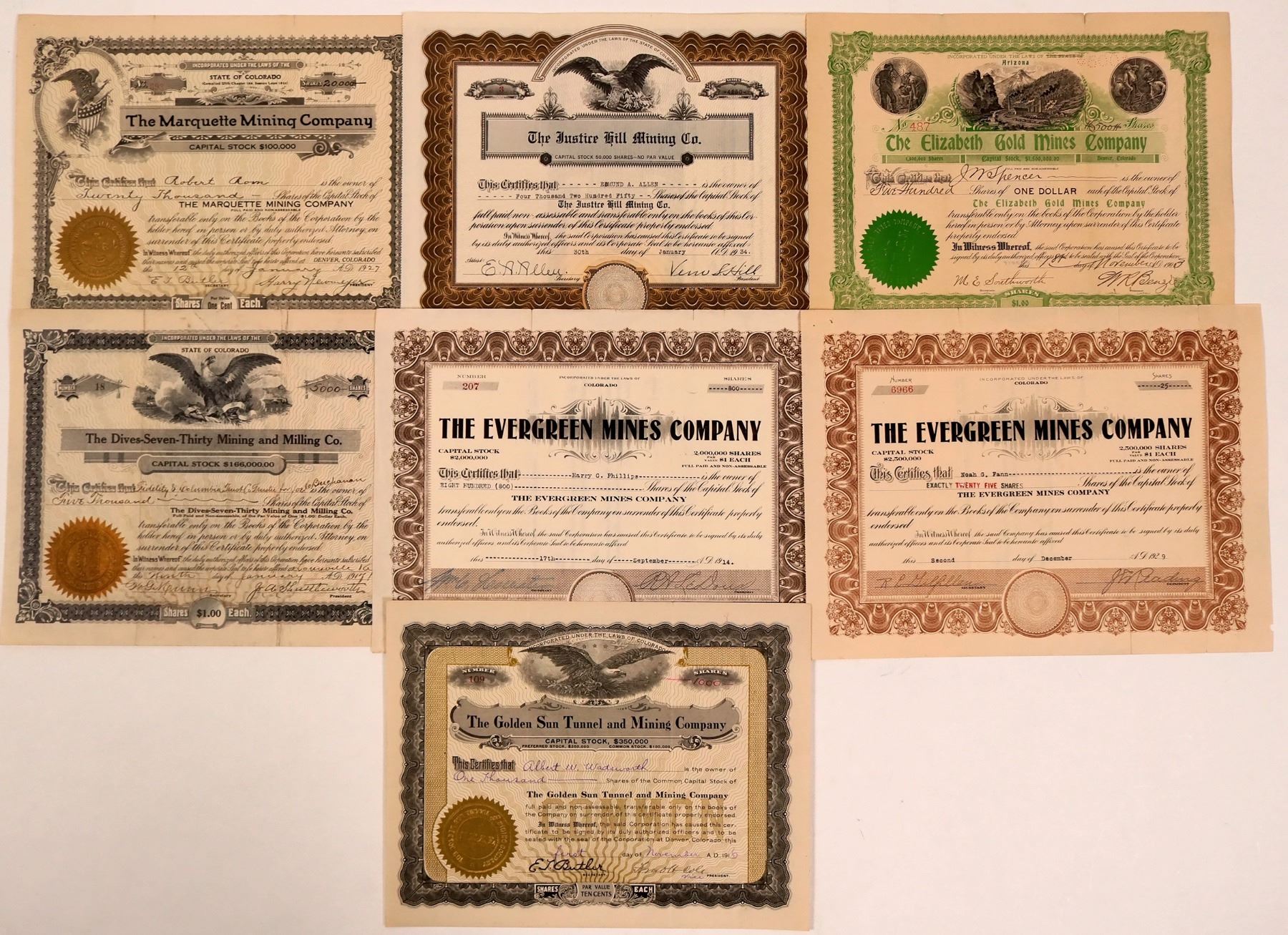 Lot of 7, most different. Included: Golden Sun Tunnel & Mining Co. (1916); Evergreen Mines Company (Apex, 1914 and 1929); Dives-Seven-Thirty Mining & Milling Co. (Georgetown, 1917); Elizabeth Gold Mines Co. (1903); Marquette Mining Company (1927); and The Justice Hill Mining Company (1934). Mixed condition.