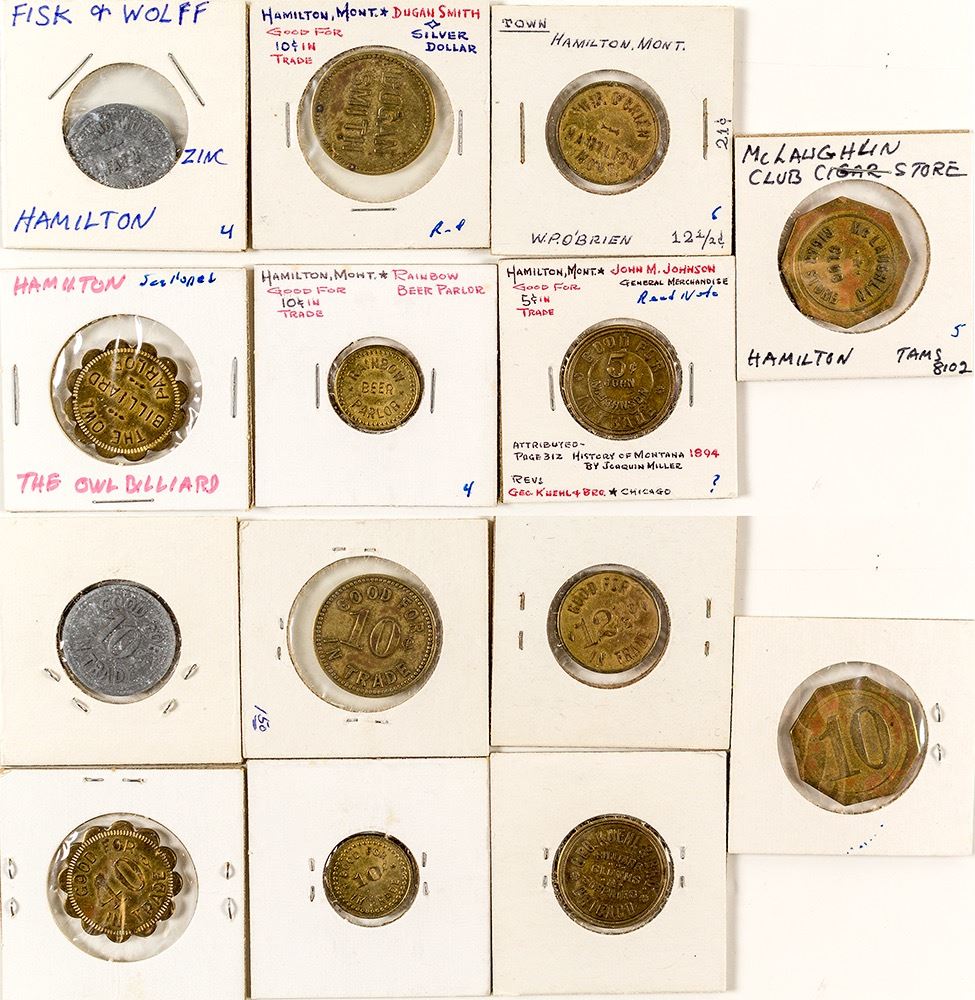 1) Geo. Kuehl & Bro. / Billiards / Cloths / 7 / supplies / Chicago // GF / 5c / John / M. Johnson / IT. Attributed, p312, History of Montana 1894 by Joaquin Miller. 2) W. P. O'Brien / Hamilton / Mont. // GF / 12 1/2c / IT. 3) The Owl / Billiard / Parlor // GF / 40c / IT. 4) Rainbow Beer Parlor // GF / 10c / IT. 5) Dugan Smith // GF / 10c / IT. 6) Fisk & Wolff // GF / 10c / IT. Zinc. 7) McLaughlin Club Cigar Store // 10c. (Svoboda Collection) City: Hamilton State: Montana Date: HWAC# 33878