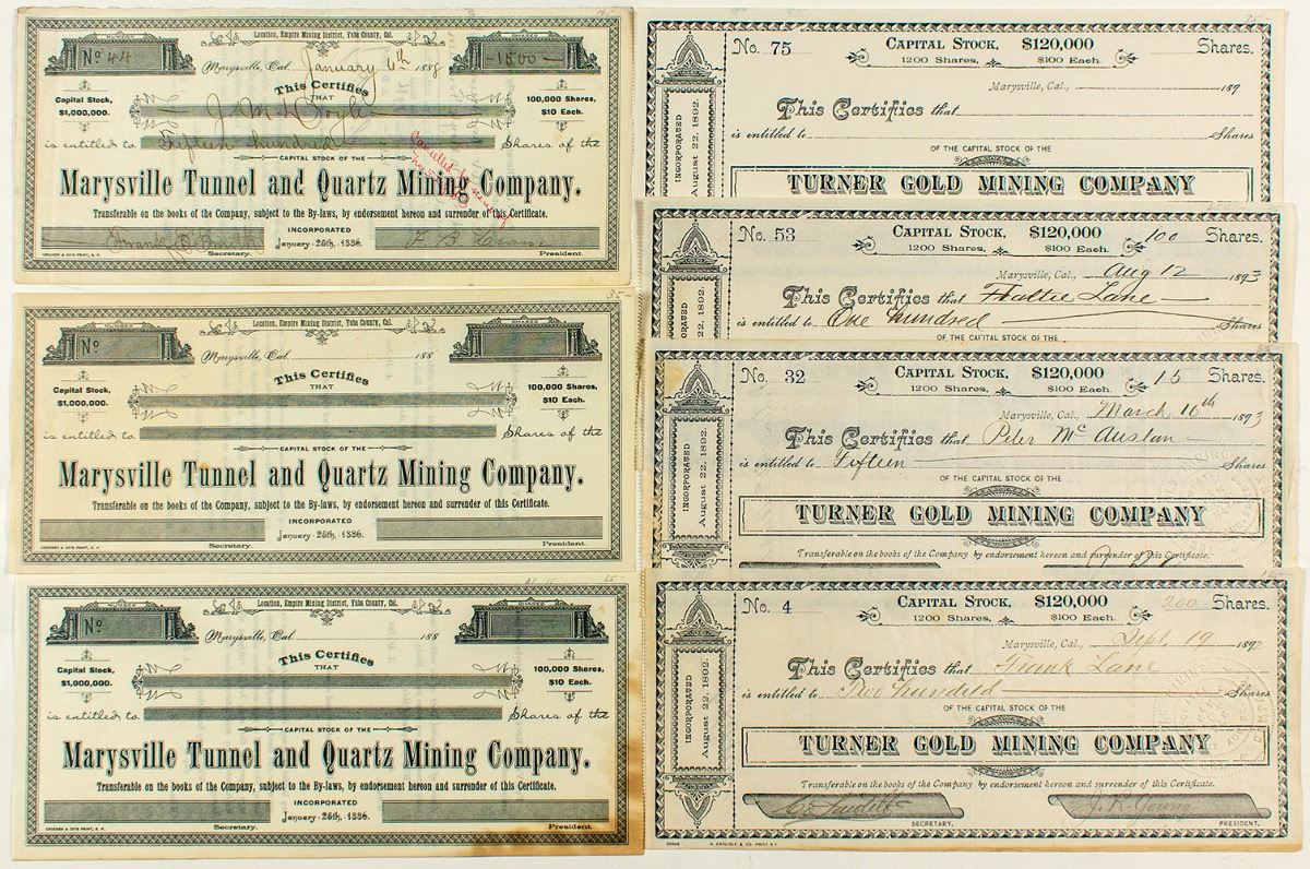Four Turner Gold Mining Company starting with #4 to 200 shares to Frank Lane in 1892. Signed by JR Young and C Sawtelle. Also numbers 32, 53, and 75. The last is unissued. Three Marysville Tunnel and Quartz Mining Company. #44 for 1,500 shares to JM Doyle in 1888. Signed by Frank Smith and FB Crane. Two unissued stocks. City: Marysville State: California Date: c1890 ID# 28745