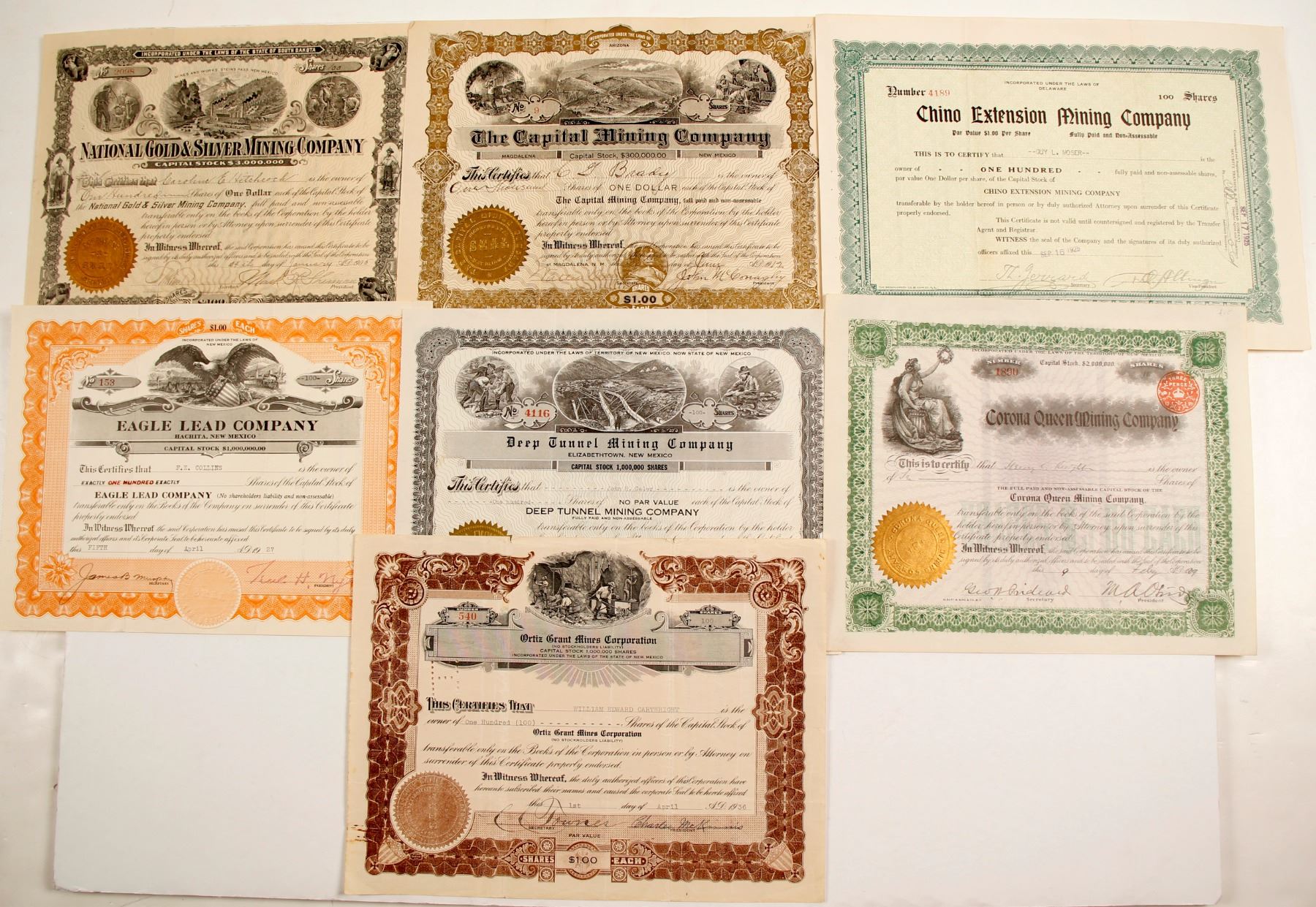 Seven capital stocks mining certificates from New Mexico. 1) One hundred shares of National Gold & Silver Mining Company, number 2098 issued to Caroline E. Hitchcock, dated January 24, 1905 signed by Mark R Sherman, president. 2) One thousand shares of Capital Mining Company, number 9 issued to G. G. Brady, dated June 20, 1912 signed by John McConaghy, president. 3) One hundred shares of Chino Extension Mining Company, number 4189 issued to Guy L. Moser, dated September 16, 1925.4) One hundred shares of Eagle Lead Company, number 153 issued to F. E. Collins, dated April 5, 1927, signed Treel H. Nye, president. 5) One hundred shares of Deep Tunnel Mining Company, number 4116 issued to John H. Caler, dated November 23, 1936, signed George E. Dachthen, president. Printed: GOES 37. 6) Ten shares Corona Queen Mining Company, number 1890 issued to Henry C. Rulght dated February 9, 1909, signed M. LA. Ohrid, president. 7) One hundred shares Ortiz Mines Corporation, number 540 issued to William Edward Cartwright dated April 1, 1936, signed Charles McKissimmis. Assigned to Ortiz Mountains Mining Corporation on February 16, 1938. Ken Prag Collection.