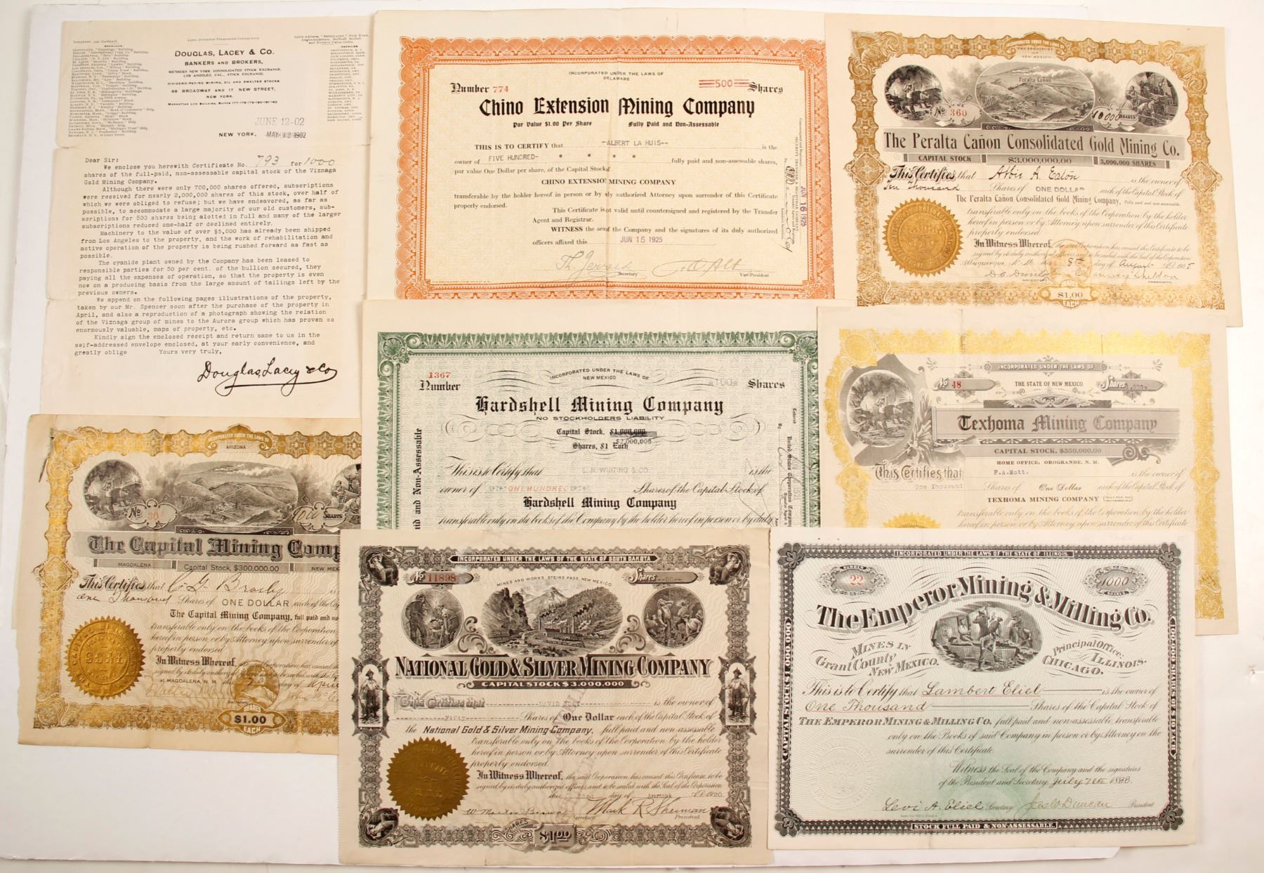 Seven New Mexico capital stock certificates. 1) One thousand shares of Emperor Mining & Milling Co., number 22, issued to Lambert Eliel, dated July 7, 1888, signed by Jaslo Duncan, president and Levi A. Eliel, secretary. Mines in Grant County, New Mexico. Vignette of miners working underground. Printed: Broun-Green Co. 2) Five hundred shares Chino Extension Mining Co., number 774, issued to Albert La Huis, dated June 15, 1925, signed by C. O. Alt, vice president. Assigned to Mary C. Goith on September 5, 1929, signed by Sigrid Lindberg, vice-president. 3) One thousand shares of Capital Mining Company, number 30, issued to C. G. Bracky, dated April 20, 1914, signed by John Mc Conaghy, president, includes a hand written letter assigning stock to C. G. Bracky on March 8, 1917, signed by John Mc Conaghy, president. 4) Eight shares of cancelled National Gold & Silver Mining Company, number 11808, issued to David Yost, dated August 23, 1920, signed by Mark R. Sherman, president, Printed: GOES - Chicago. 5) One Thousand shares of Texhoma Mining Company, number 48, issued to F. A. Mott, dated April 10, 1917, signed L. D. Bakey, president. Printed: GOES. 6) One hundred shares of Hardshell Mining Company, number 1367, issued to E. H. Whiting & Co., dated November 23, 1921. Printed: Bround-Green Co. 7) Ten thousand shares of Peralta Canon Consolidated Gold Mining Co, number 360, issued to Abbie A. Easton, dated August 8, 1905. 8) Letter from Douglas Lacy & Company saying that Certificate No 793 of capital stock for the Viznaga Gold Mining Company is enclosed. and to sign for receipt and return. Ken Prag Collection.